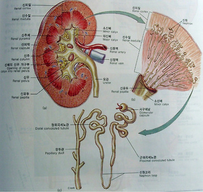 (a)신피질, 신수질 및 신우의 위치, (b)신피질과 신수질 상에 위치한 신원의 모식도 (c)단일 신원 및 유두관의 모식도.