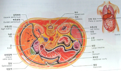 [복부의 횡단면상에서 관찰되는 신장의 위치]