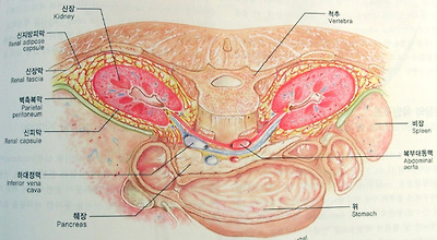 (신장은 벽측복막 뒤에 지방조직 속에 매몰되어 있다.)