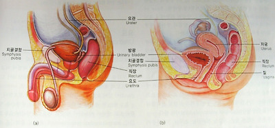 (a)남성: 방광은 치골결합과 직장 사이에 위치한다. (b)여성: 방광은 치골결합과 자궁 및 질 사이에 위치한다.