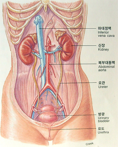 [비뇨기계는 신장, 요관, 방광 및 요도로 구성된다.(여성모식도)]
