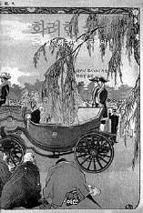 왼쪽 그림에서 군기를 든 기마부대가 지나가고 눈앞에는 이제 막 화려한 서양식 궁정마차가 지나가고 있다. 아낙부터 멋들어진 실크햇을 쓴 서구풍 신사까지, 길가에 늘어선 백성들의 눈길은 한 곳을 응시하고 있다. 맨 앞의 노인들은 절로 엎드려 신민의 예를 표하고 있다.