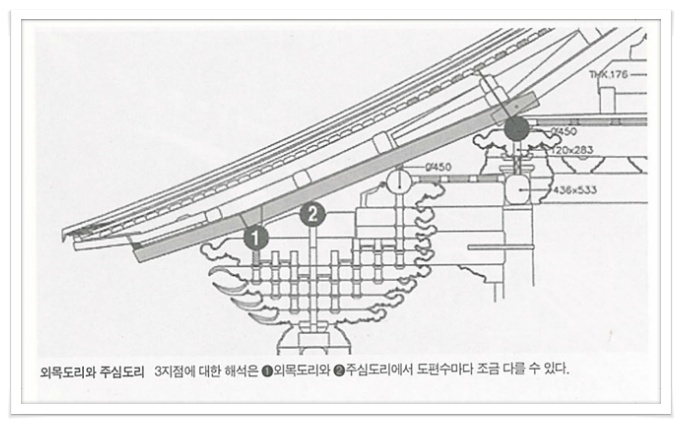 ㅇ추녀와 서까래의 3개 지지점은 평고대, 처마도리, 중도리 지점이다