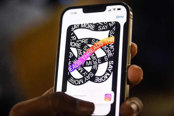 2023년 7월, 한 기술 회사 직원이 휴대폰에 새로 공개된 스레드 앱을 다운로드하고 있습니다. 스레드는 메타에서 출시한 텍스트 기반 소셜 미디어 앱입니다. 한국의 많은 온라인 커뮤니티는 텍스트 기반이며, 이미지 및 동영상 게시물도 제공합니다. [EPA/연합]