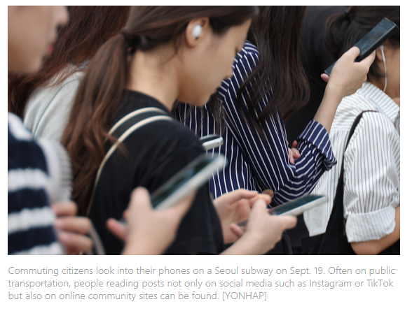 Commuting citizens look into their phones on a Seoul subway on Sept. 19. Often on public transportation, people reading posts not only on social media such as Instagram or TikTok but also on online community sites can be found. [YONHAP]