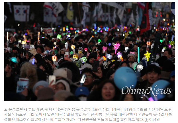 | Young women in Seoul lead nonviolent protests 비폭력 시위를 주도한 서울의 젊은 여성들 The traumatic memories of tension and fear sparked by the brief emergency martial law on Dec. 3 did not lead to significant casualties on South Korea's streets. However, the confusion and uncertainty over how to hold the president accountable intensified in the days leading up to the National Assembly's decisive impeachment vote on Dec. 14. Despite these challenges, the nation witnessed its legislature pass the impeachment motion against the president just 11 days after the martial law debacle — without any violence or casualties. 12월 3일 짧은 비상 계엄령으로 촉발된 긴장과 공포의 트라우마적 기억은 한국 거리에서 큰 인명 피해로 이어지지 않았습니다. 그러나 12월 14일 국회의 결정적인 탄핵 표결을 앞둔 며칠 동안 대통령에게 책임을 묻는 방법에 대한 혼란과 불확실성은 더욱 심화되었습니다. 이러한 어려움에도 불구하고 계엄령이 무너진 지 불과 11일 만에 폭력이나 인명 피해 없이 대통령에 대한 탄핵안이 국회에서 통과되는 것을 목격했습니다. Massive crowds gathered, but instead of the Molotov cocktails seen in the protests of the 1980s or the solemn candles held during the 2016 movement to impeach former President Park Geun-hye, their hands nothing of the sort. 대규모 군중이 모였지만 1980년대 시위에서 볼 수 있는 화염병이나 2016년 박근혜 전 대통령 탄핵 운동 당시 들고 있던 엄숙한 촛불 대신 그들의 손은 그런 종류의 것이 아니었습니다. Instead, participants waved colorful LED K-pop light sticks as they sang along to popular K-pop songs. These light sticks, which typically fill concert venues with a sea of fan devotion for K-pop stars, were easy to carry and durable, according to rally goers. For die-hard K-pop fans, these cheer gear items were among their most treasured possessions. 대신 참가자들은 화려한 LED 케이팝 라이트 스틱(응원봉)을 흔들며 인기 케이팝 노래를 따라 불렀습니다. 랠리 참가자들에 따르면 일반적으로 콘서트장을 가득 채운 이 라이트 스틱(응봉)은 휴대가 간편하고 내구성이 뛰어났다고 합니다. 열성적인 케이팝 팬들에게 이 응원 장비는 가장 소중한 물건 중 하나였습니다. Music has the power to touch the heart, and one of the reasons K-pop songs gained global popularity is because their lyrics and performances often inspired hope and self-confidence in listeners. This made it unlikely for the rallies to turn violent. While the potential for violence existed, the participants expressed their civic desire to see President Yoon Suk Yeol impeached over the emergency martial law declaration. Reuters described the cheer gear as symbolizing "non-violence and solidarity." 음악은 마음을 울리는 힘을 가지고 있으며, 케이팝 노래가 세계적으로 인기를 얻은 이유 중 하나는 가사와 공연이 청취자들에게 희망과 자신감을 불어넣는 경우가 많았기 때문입니다. 이로 인해 집회가 폭력적으로 변할 가능성은 낮았습니다. 참가자들은 폭력의 가능성이 존재하는 동안 비상 계엄령 선포에 대해 윤석열 대통령이 탄핵되는 모습을 보고 싶다는 시민적 열망을 표현했습니다. 로이터 통신은 이 응원 장비가 "비폭력과 연대"를 상징한다고 설명했습니다. The glowing K-pop cheer lights highlight the significant shift in the civic spirit, showing how peaceful rallies have evolved over the decades. With a sense of relief and discovery, we recognize that this same civic spirit was reflected in the reluctant soldiers who were ordered to enter the National Assembly on the night of Dec. 3, as lawmakers gathered to vote on the impeachment motion against the president. The turbulent history of modern Korean politics has taught the population the importance of democracy, no matter how fragile, and the value of life. 빛나는 케이팝 응원전은 시민 정신의 중대한 변화를 강조하며 수십 년 동안 평화로운 집회가 어떻게 발전해왔는지 보여줍니다. 안도감과 발견의 마음으로 12월 3일 밤 국회 입성을 명령받은 마지못해 희생된 군인들에게도 같은 시민 정신이 반영되었음을 알 수 있습니다. 현대 한국 정치의 격동적인 역사는 국민들에게 아무리 연약해도 민주주의의 중요성과 생명의 가치를 가르쳐주었습니다. Not only that, both ordinary citizens and well-known figures, such as singer IU, pitched in to cover the cost of food and beverages for many of the pro-impeachment rally participants in Yeouido, where the National Assembly is located. A photo in a local newspaper showed women making "jumeokbap" (hand-rolled rice balls) to share with the people in Gwangju. Meanwhile, supporters of the president had gathered in Gwanghwamun but peacefully dispersed after Assembly Speaker Woo Won-shik announced that the impeachment motion had passed with 204 votes in favor and 85 votes against. 뿐만 아니라 국회가 있는 여의도에서 탄핵 찬성 집회 참가자들의 식음료비를 충당하기 위해 일반 시민들과 가수 아이유 등 유명 인사들도 동참했습니다. 한 지역 신문에 실린 사진에는 광주 시민들과 나누기 위해 여성들이 '주먹밥'을 만드는 모습이 담겨 있었습니다. 한편, 우원식 국회의장이 탄핵안이 찬성 204표, 반대 85표로 통과되었다고 발표한 후 대통령 지지자들은 광화문에 모였지만 평화롭게 흩어졌습니다. Even in Daegu, a city in the southeastern part of Korea known as a conservative bastion, people gathered in groups on Dongseongno, holding up playful banners such as "Impeachment is the answer." The maturity of the Korean c