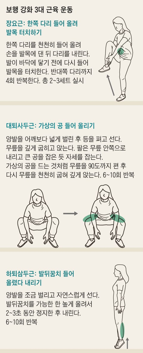 근육 전문가들은 장요근, 대퇴사두근, 하퇴삼두근을 걸음걸이를 활기차게 만드는 3대 보행 근육으로 꼽는다.
