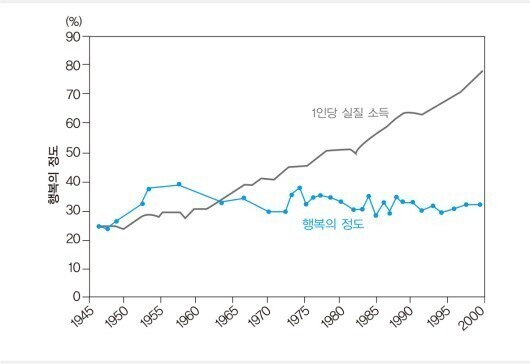 이제 실증적 연구 결과를 보자. 소득이 오를수록 더 행복할 것이라는 가정은 여러 선진국의 연구 결과를 통해 오류로 판명되고 있다. 국내총생산은 지난 반세기 동안 지속적으로 증가했고, 그에 따른 개인의 소득도 상승세를 이어왔지만 사람들이 느끼는 행복의 정도는 전혀 증가하지 않은 것이다.