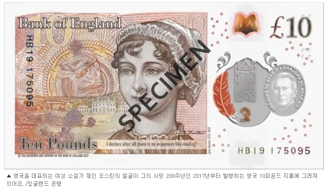소설 '오만과 편견' 같은 작품으로 서양 문학사에 중요한 발자취를 남긴 영국 작가 제인 오스틴(1775~1817)은 영국 10파운드 지폐에 초상화가 실려 있습니다. 2017년 사망 200주년을 기념한 것이죠. 초상화 아래에는 '오만과 편견'에 나오는 문구가 적혀 있습니다. "결국 읽는 것만큼 즐거운 것은 없다고 선언한다!(I declare after all there is no enjoyment like reading!)" 이 문장은 오스틴이 문학에 끼친 영향을 상징한다고 할 수 있겠습니다.