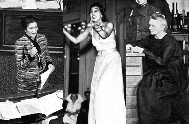 ▲ 왼쪽부터 시몬 베유가 1974년 프랑스 의회에서 낙태 합법화를 설득하는 연설을 하는 모습. 조세핀 베이커가 1940년 프랑스 파리의 한 호텔에서 제2차 세계대전 중 휴가를 나온 영국군을 위해 노래하는 모습. 마리 퀴리가 1919년 제1차 세계대전 중 파리 라듐 연구소에서 미국 원정군(AEF)과 기념사진을 찍는 모습. /위키피디아