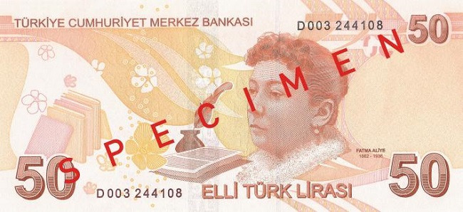 ▲ 이슬람권 최초의 여성 소설가 파트마 알리예 토푸즈가 실린 튀르키예의 50리라 지폐. /위키피디아