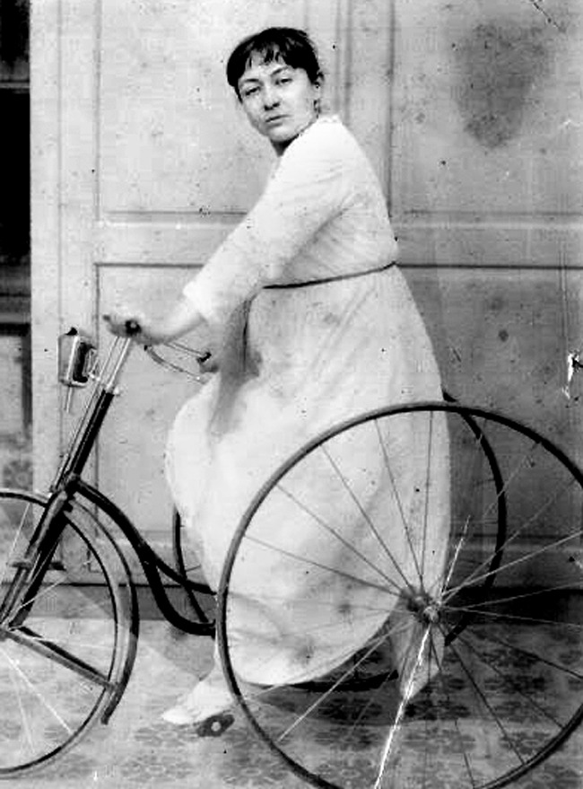 ▲ 토푸즈 또는 그의 딸로 추정되는 인물이 자전거를 타는 시늉을 하며 사진을 찍고 있어요. 토푸즈가 태어난 19세기 말부터 서구권을 중심으로 여성도 자전거를 타는 문화가 생겨났어요. /위키피디아