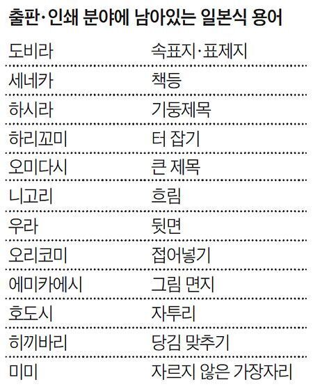 출판·인쇄 분야의 용어는 크게 인쇄⋅종이⋅출판⋅제본으로 나눠볼 수 있는데 특히 인쇄 쪽에 일본어가 많이 남았다. 하시라(판면 바깥 여백부에 짜 넣는 제목의 일종)는 ‘기둥제목’으로, 하리꼬미는 ‘터 잡기’로 바꿔 쓸 수 있다. 이 교수는 “도제 체제로 전문 기술이 전수되고 새로 이 분야에 진입하는 교육생에 대한 초기 교육을 일본어 용어를 쓰던 현장 실무자가 담당하면서 일본어 용어가 아무 문제 의식 없이 확대 재생산됐다”며 “대부분의 인쇄 기자재가 일본에서 수입되면서 일본어로 된 기계 부품명이나 사용 방법 등이 우리말로 순화되지 못한 채 사용됐다”고 했다.