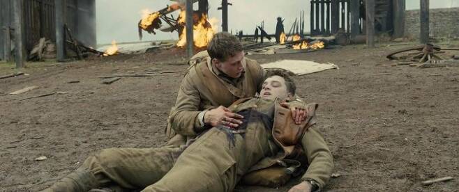영화 ‘1917’의 한 장면. 등장 인물인 블레이크(딘-찰스 채프먼)는 칼에 찔린 뒤 오한을 느끼다가 수분 내에 사망한다./사진=영화 ‘1917’ 캡처