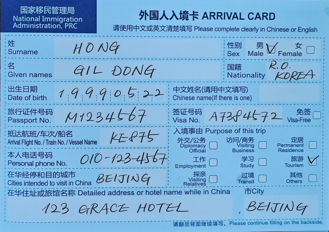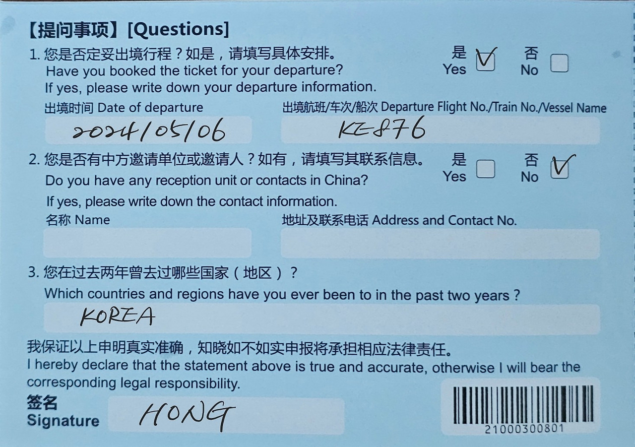 *중국 입국 신고서 받아 아래와 같이 작성한다