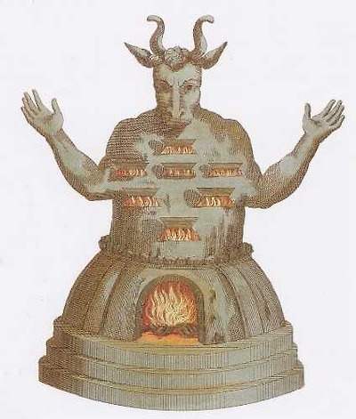 ‘몰렉’은 암몬족의 신인데 '그모스'와 마찬가지로 어린아이들을 인신제사로 바쳤던 신으로서 제사 의식 중에는 어린아이를 불 위로 걷게 하거나, 또는 불에 달군 기둥 위를 걷게 하는 잔인한 의식이 있었습니다.