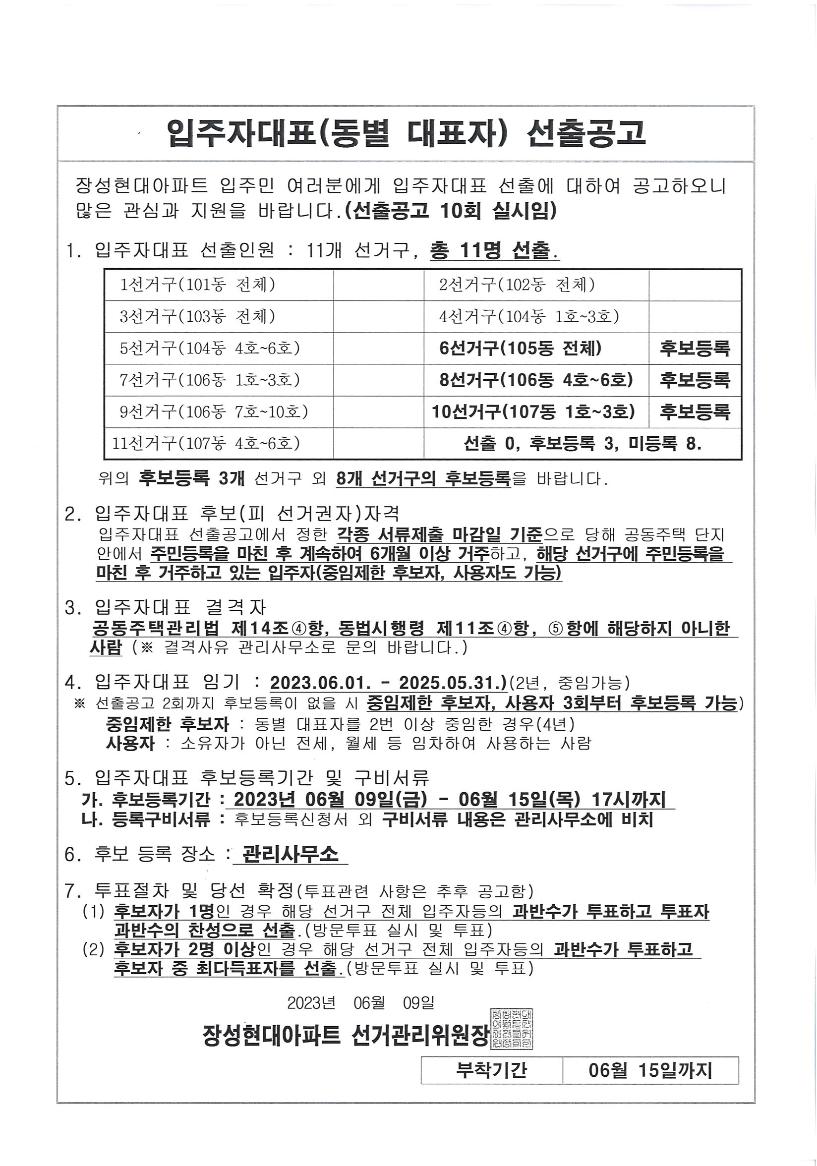 입주자대표회의(제15대) 선출을 실시하고 있습니다.(선출공고 10회)