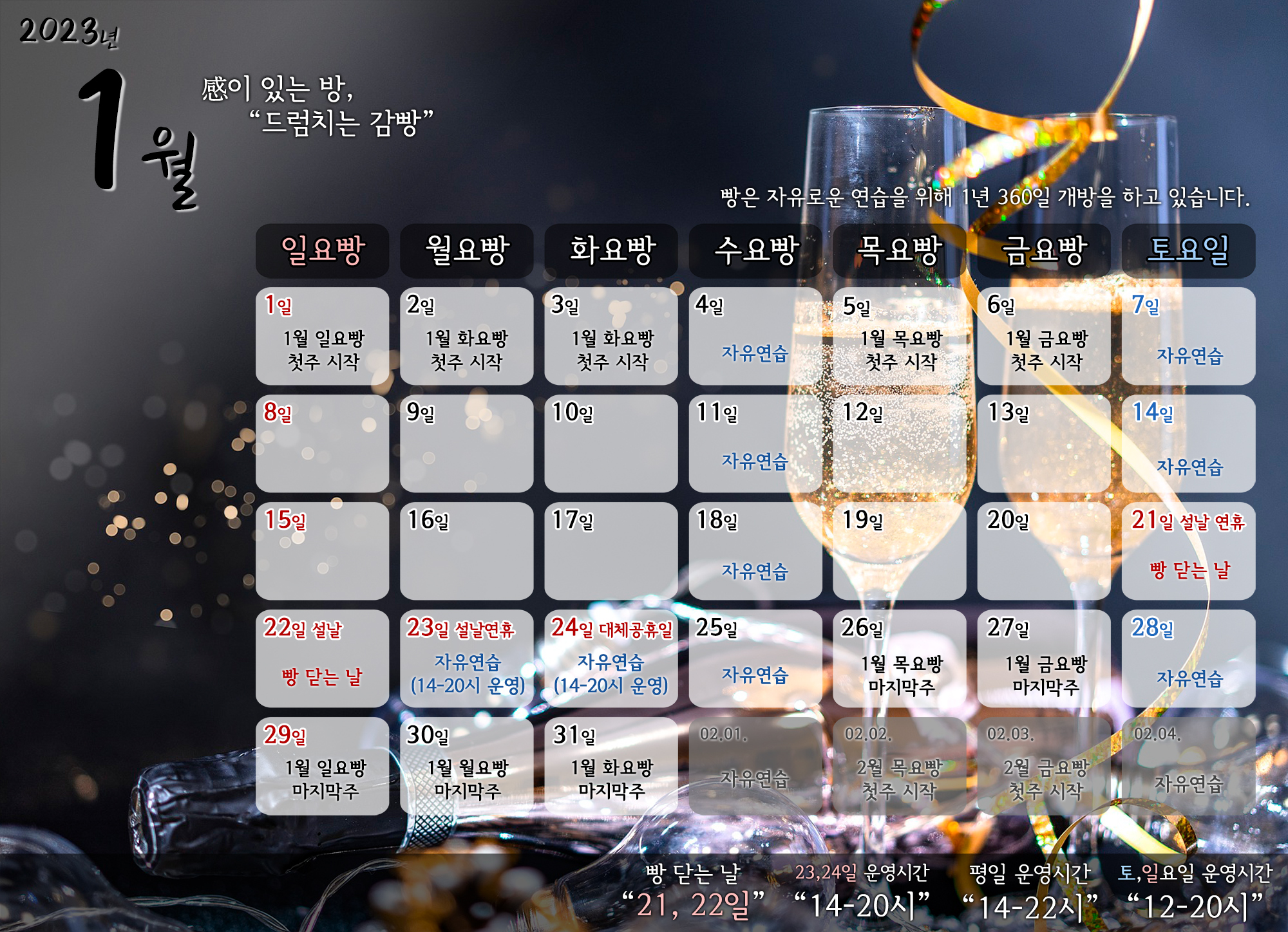 빵은 빵멤버들께서 자유로운 연습을 하실 수 있도록 1년 360일 개방을 하고 있습니다.