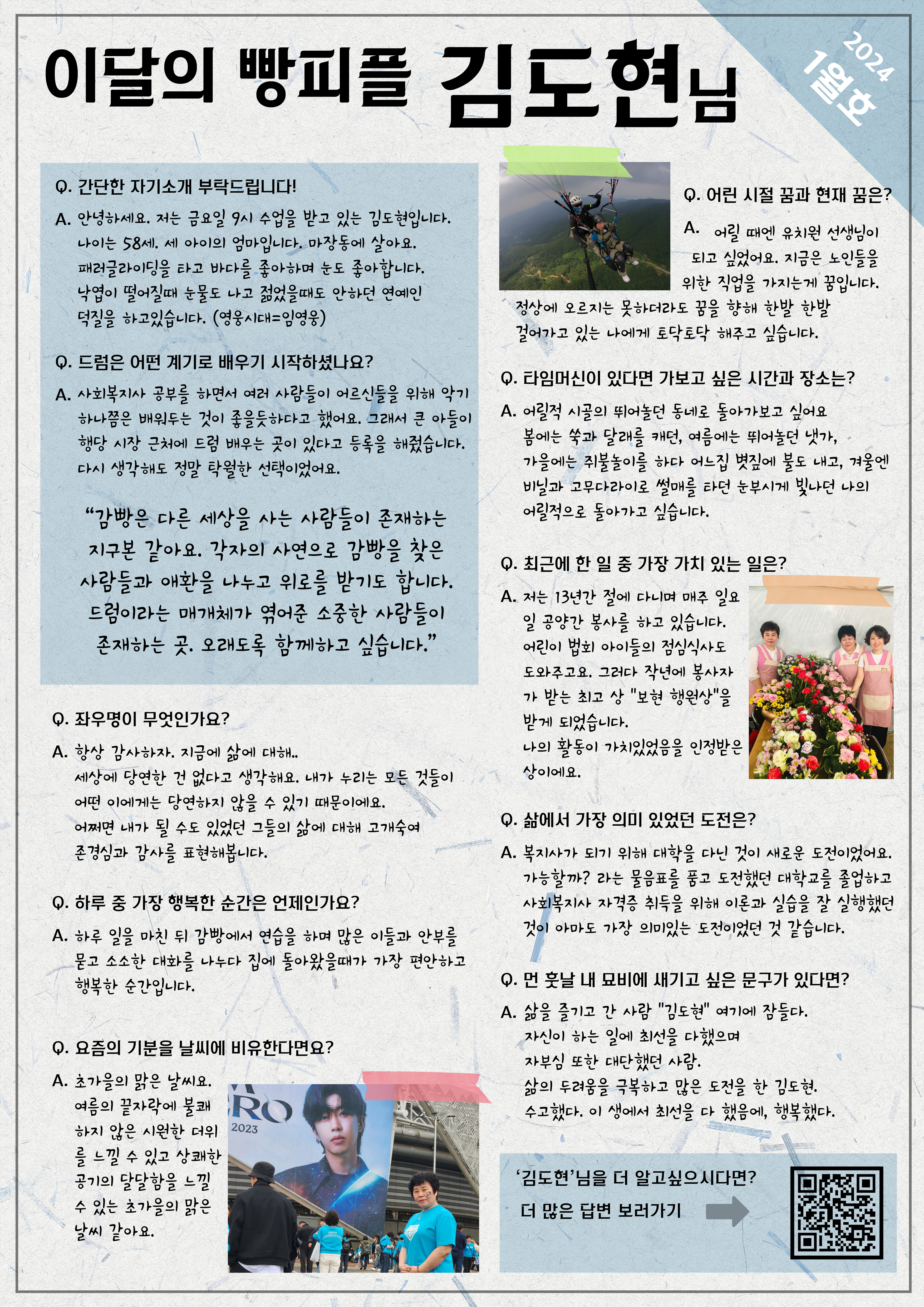 A. 금요일 9시 수업을 받고 있습니다. 근엄하신듯 하지만 다정하신 재홍님! 파워풀하시고 하얀 수염이 매력적이신 병구님! 친구가 되고싶은 수줍게 짓는 미소가 멋진 상호님과 재미있고 신나게 드럼을 즐기고 있습니다.