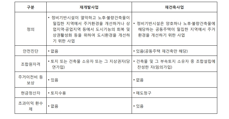 「도시 및 주거환경정비법」상의 재개발사업과 재건축사업은 다음과 같이 구분됩니다.