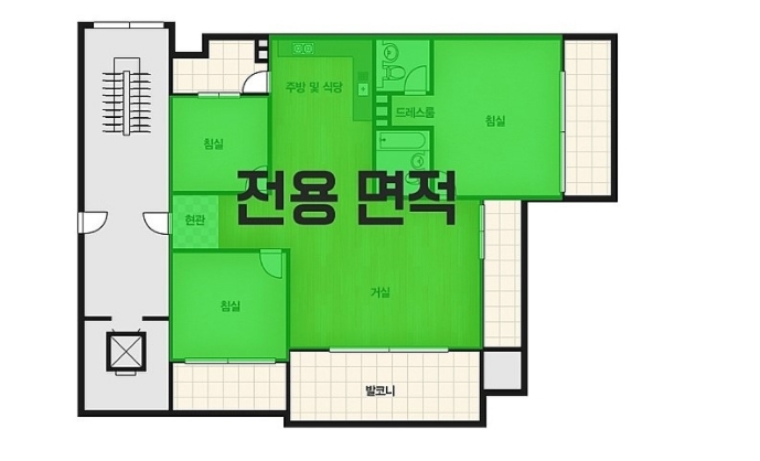 전용면적 = 현관 안쪽의 주거 공간 (거실, 침실, 화장실, 주방, 현관)
