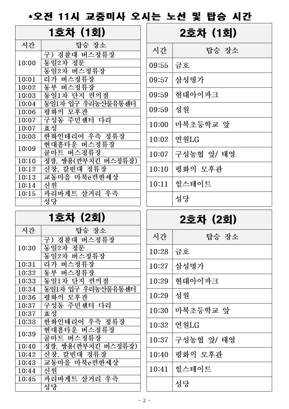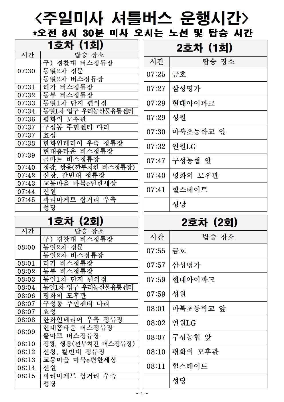 주일미사 셔틀버스 운행 시간(2022. 07. 24 수정) 작성자사무실|작성시간22.06.04|조회수1,973 목록 댓글 0 글자크기 작게가 글자크기 크게가 다음검색 현재 게시글 추가 기능 열기 북마크 공유하기 신고 센터로 신고 댓글 댓글 0 댓글쓰기 답글쓰기 댓글 리스트