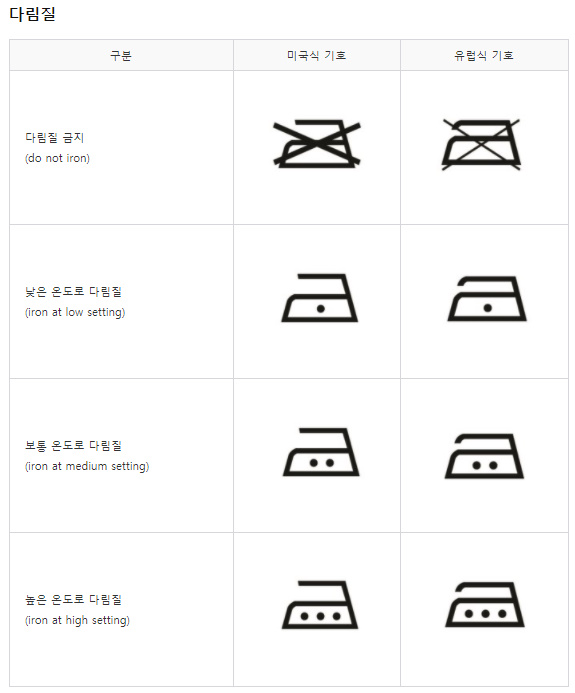 미국식, 유럽식 표기로 다리미 온도에 대한 표기방법은 블로그의 아래쪽에 보면 추가로 나와있습니다.