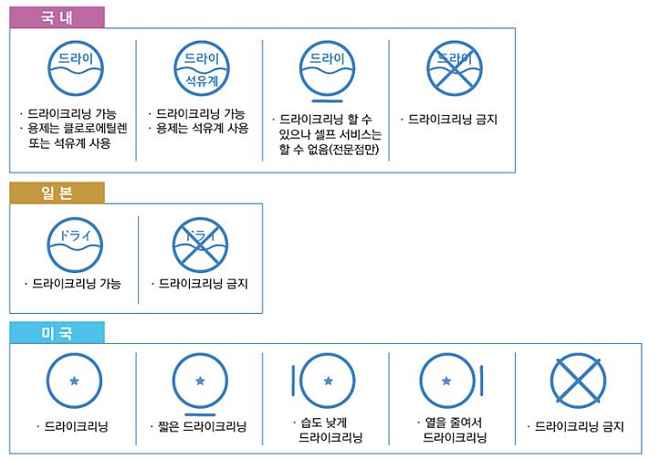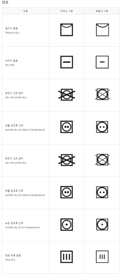 외국의 경우 건조기를 사용해서 건조시키는 것이 오래전부터 일반적이라서 건조부분에 대한 표시가 되어있더라고요. 요즘 우리나라도 건조기 사용을 많이 하기때문에 이 부분도 알아두면 좋을 것 같습니다.