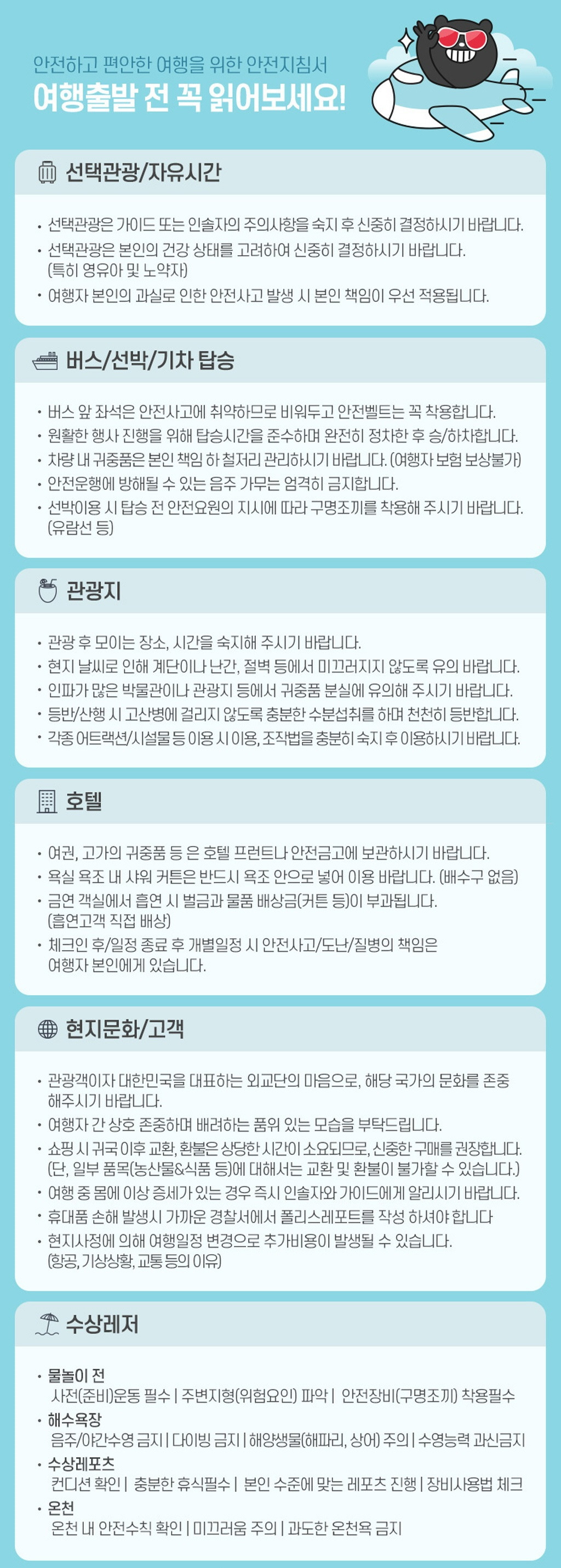 가이드 및 인솔자가 동반하지 않은 자유시간에 고객님의 안전을 위하여 현지 주의사항을 숙지하시고 고객님의 과실과 건강상태로 인하여 발생한 안전사고에