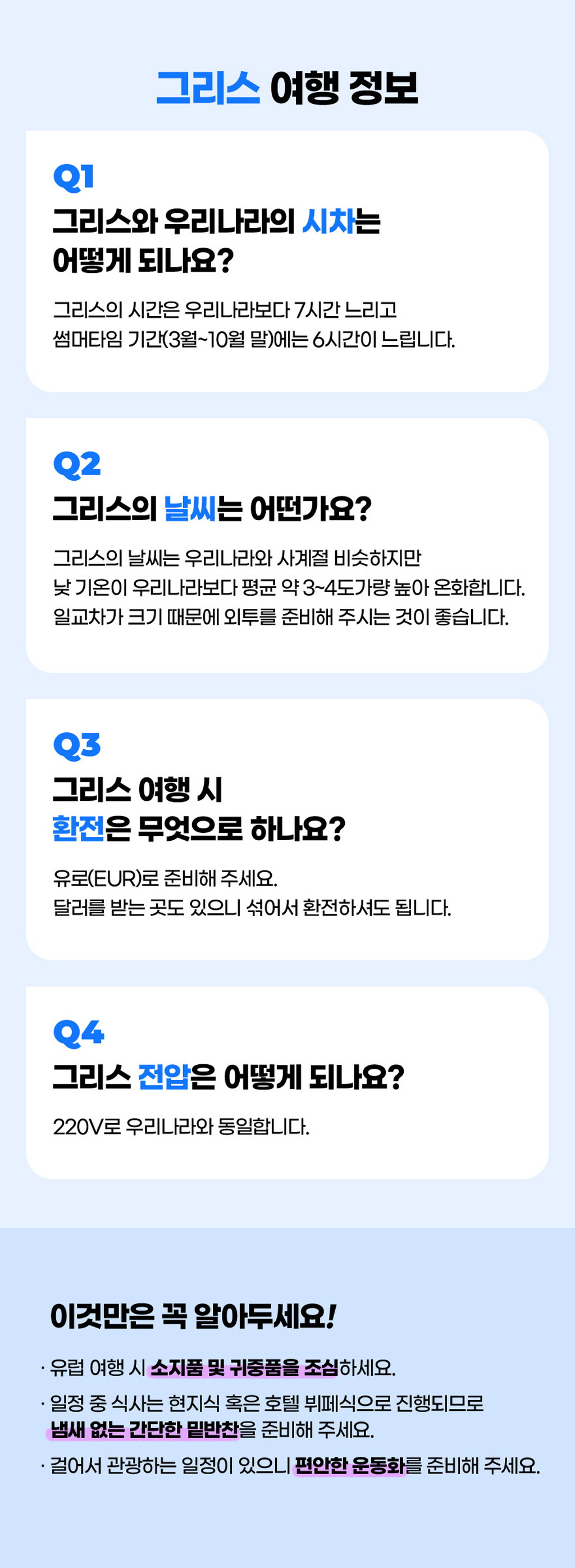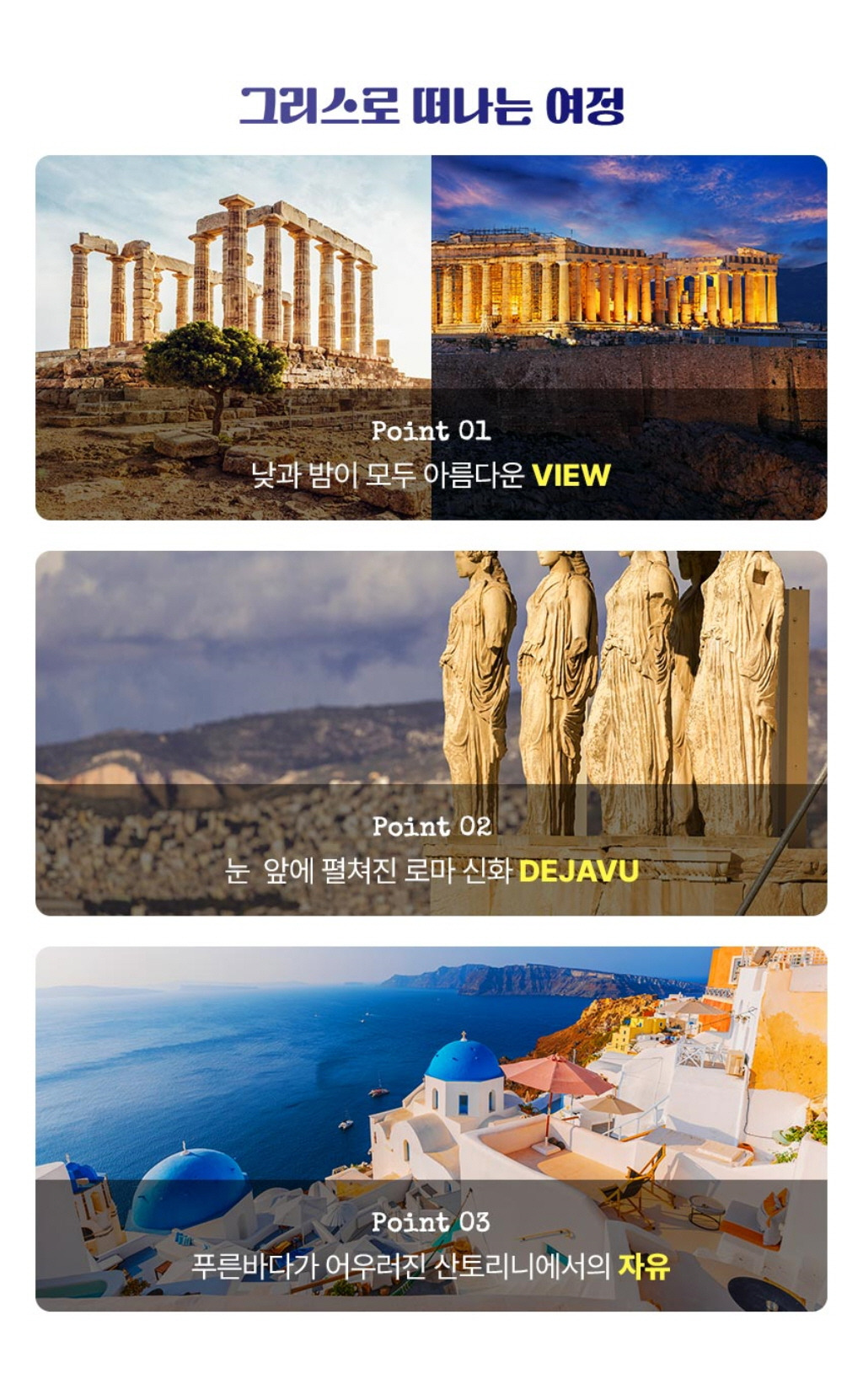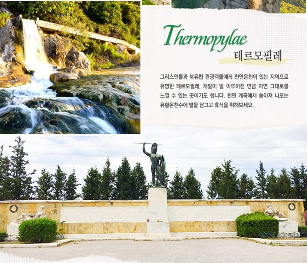 | 포함사항 | 1. 왕복항공권(인천공항세,관광진흥기금 포함) 2. 전문 인솔자 동행 3. 전문 현지가이드 동반(그리스 현지에서 미팅) 4. 일급 호텔 숙박 5. 관광지 입장료 6. 산토리니 자유일정 7. 4대특식(수블라끼,기로스,그리스가정식,그릭요거트) 8. 아테네 시내관광 9. 바다전경 감상 수니온 10. 기암 절벽 위 메테오라 수도원 11. 영화 '300'의 배경지 테르모필레 12. 1억원 여행자 보험 |