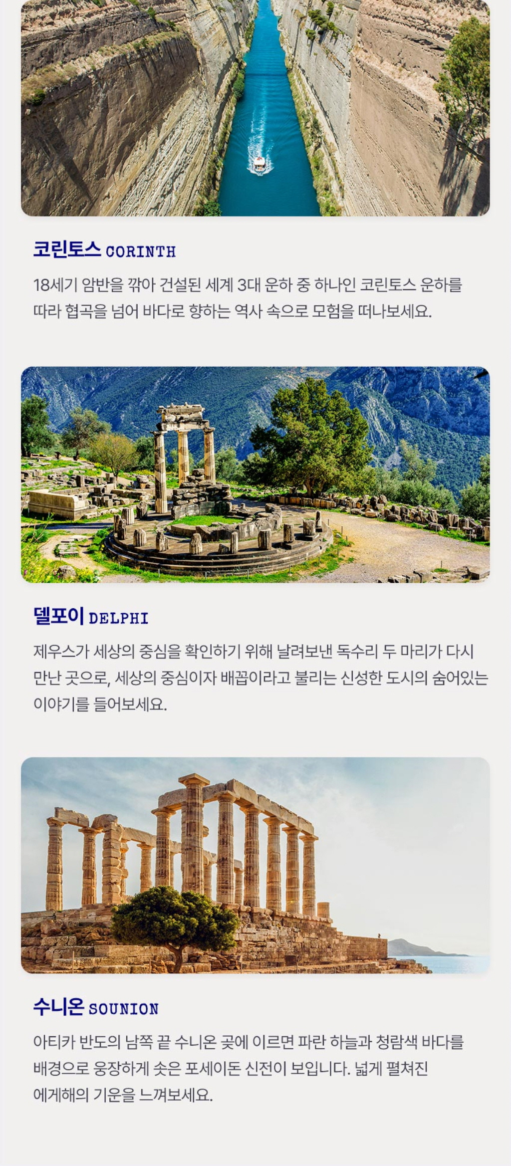 | 5 | 델피 유적지 | 대지의 배꼽인 델피 신전방문 | 70유로 | 약 40분 | 마을주변에서 자유시간을 가집니다. | 마을주변 | 미동행 |