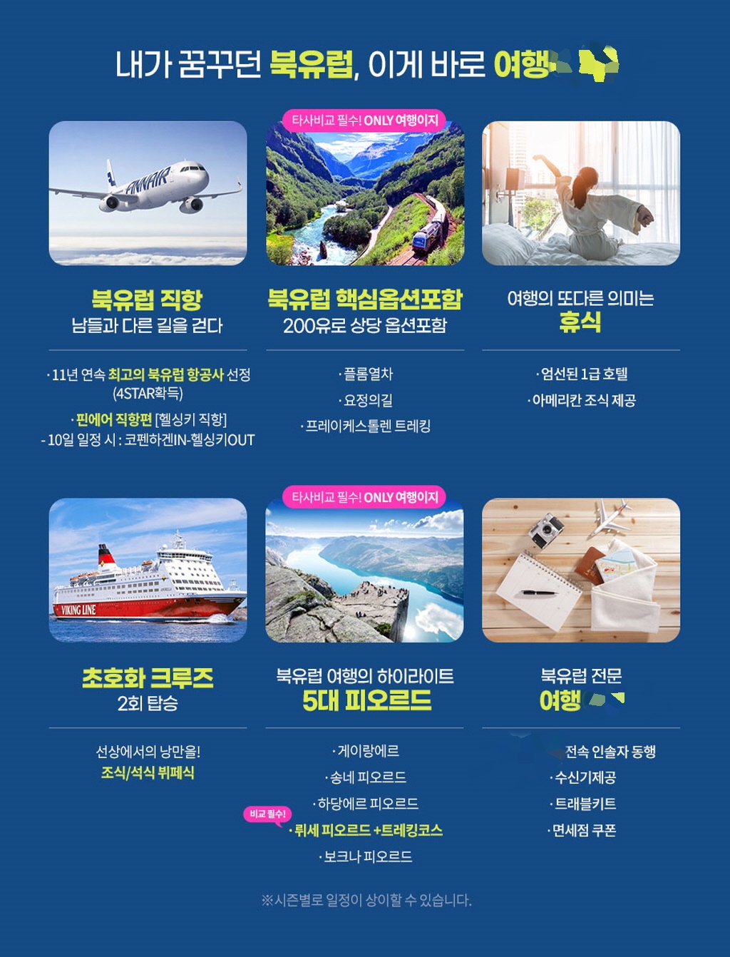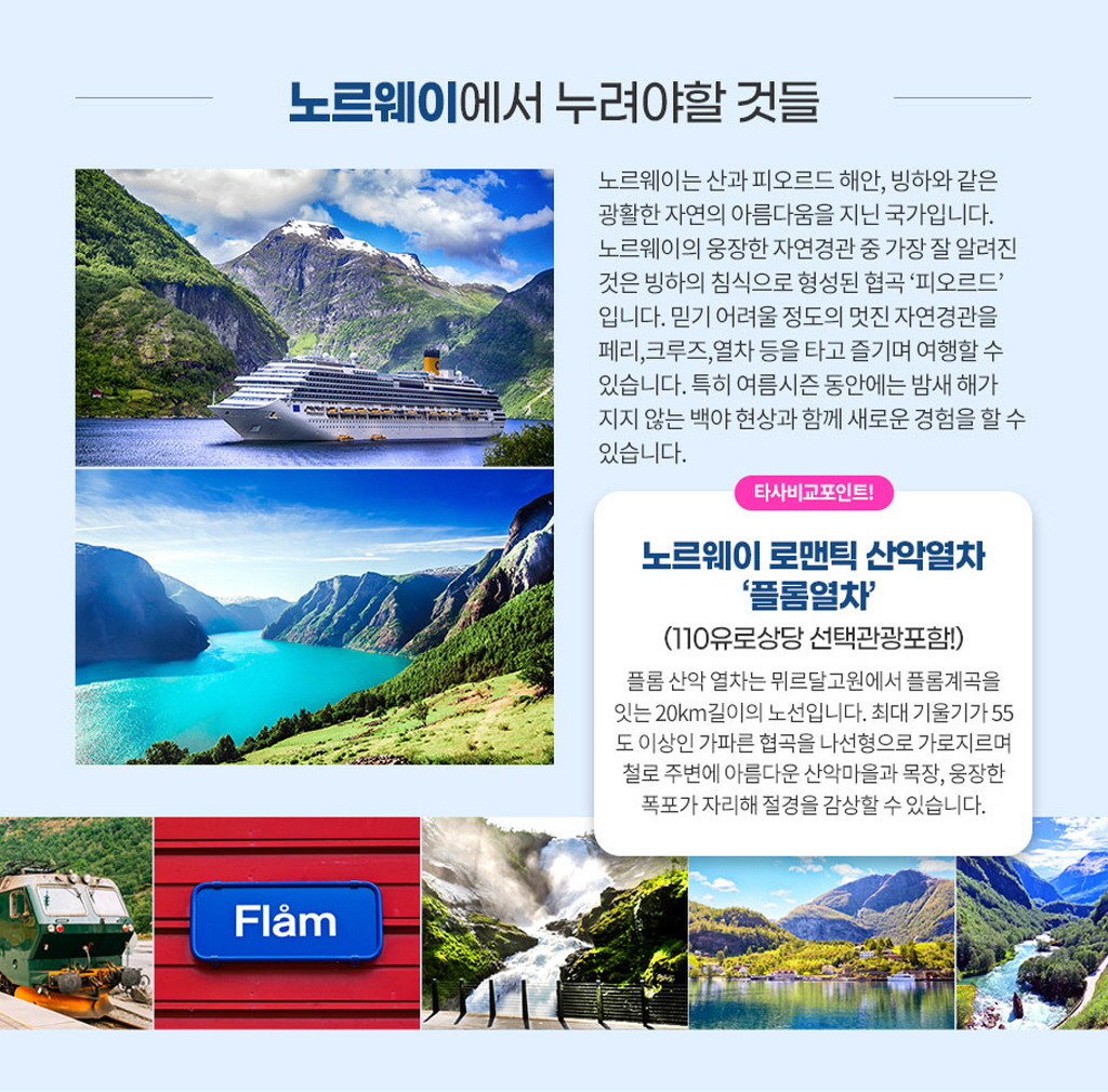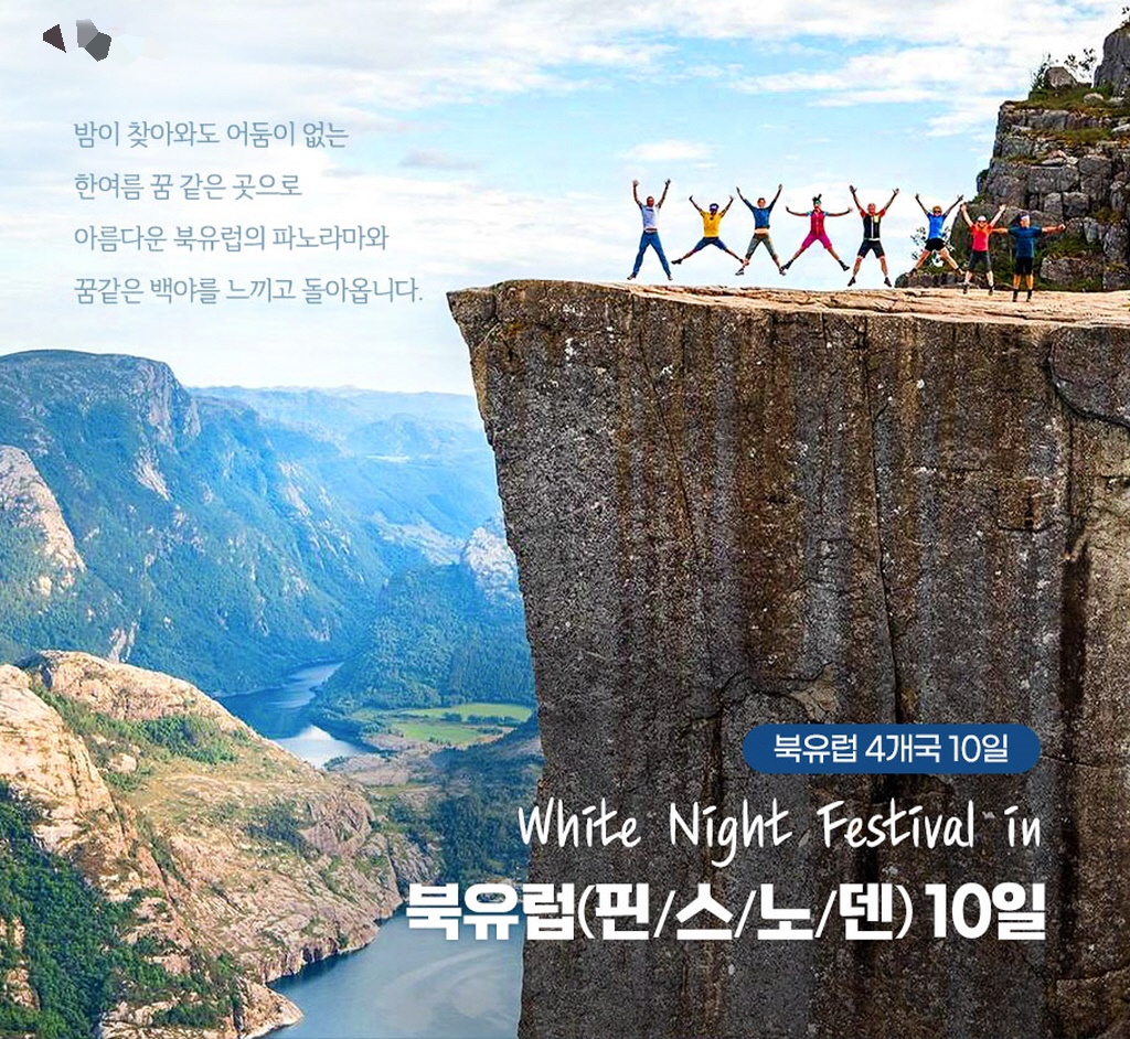 | 포함사항 | [왕복항공권]핀에어[핀란드]항공_북유럽 유일의 노선[11년연속 북유럽 최고의항공사/4성획득] [유류할증료]유류할증료는 매달 변동가격이 적용되므로 변경 될 수 있습니다. [일정표상의 숙박]전일정 일급호텔 (2인 1실 기준)+크루즈2회 [일정표상의 식사]전일정식사포함+크루즈선상뷔페4회포함 [일정표상의 관광지 입장료]260유로상당 핵심 옵션포함 (플롬열차+요정의길+프레이케스톨렌트레킹+뤼세피오르드조망) [전용차량]45인승 대형버스 [여행자 보험]1억원여행자보험 [샌딩비] |