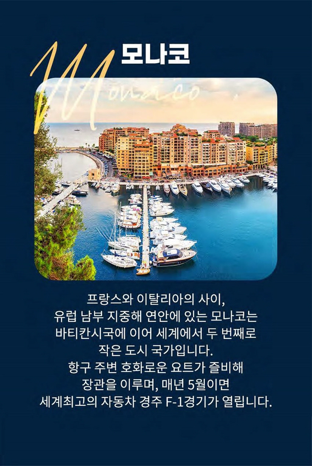 프랑스와 이탈리아의 사이, 유럽 남부 지중해 연안에 위치한 모나코는 바티칸시국에 이어 세계에서 두 번째로 작은 나라입니다.