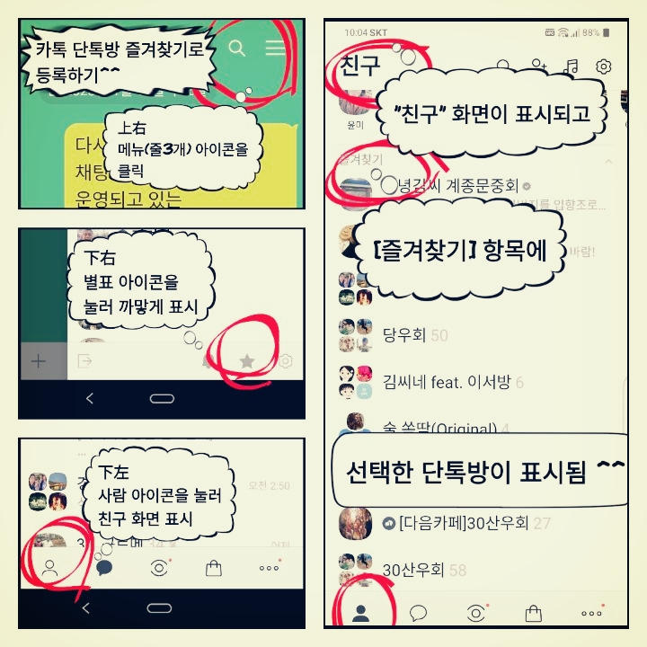 아래와 같이 [즐겨찾기]에 단톡방을 등록해 두면 [친구] 화면에서 쉽게 찾을 수 있소이다.
