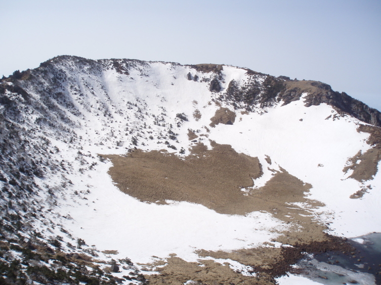 정상에서 헬기장 내려오는 중간 중간에서 보는 백록담의 뒷 켠은