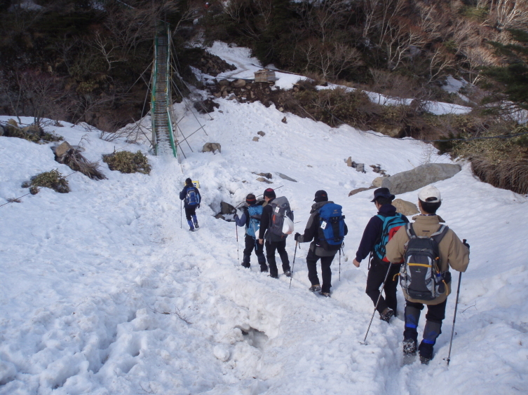 왼편 斜面이 급경사의 설원이라 모두들 조심하며 한 발짝씩 내어 딛는다.