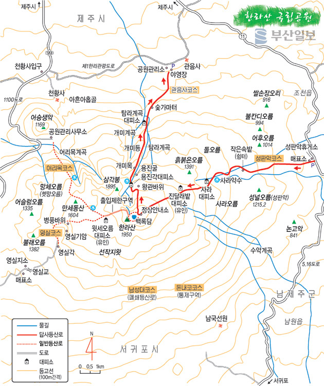 ①답사등산로(붉은 실선) : 첫날 산행로(성판악-백록담-관음사)