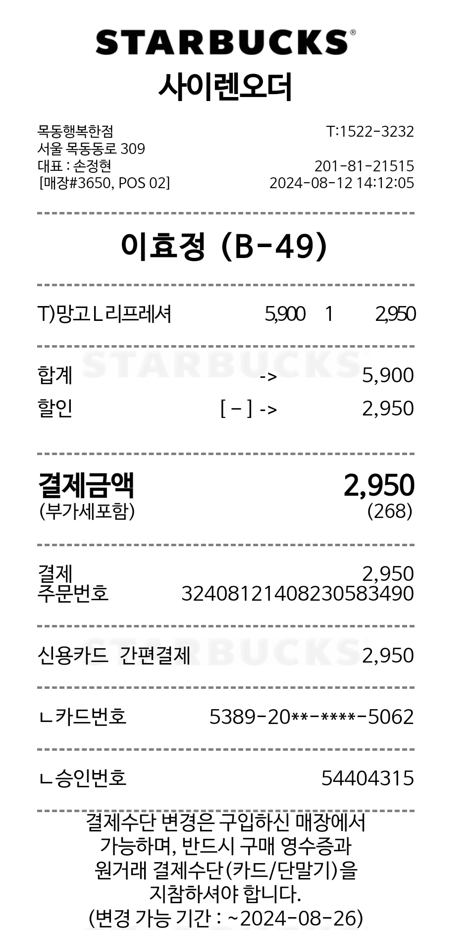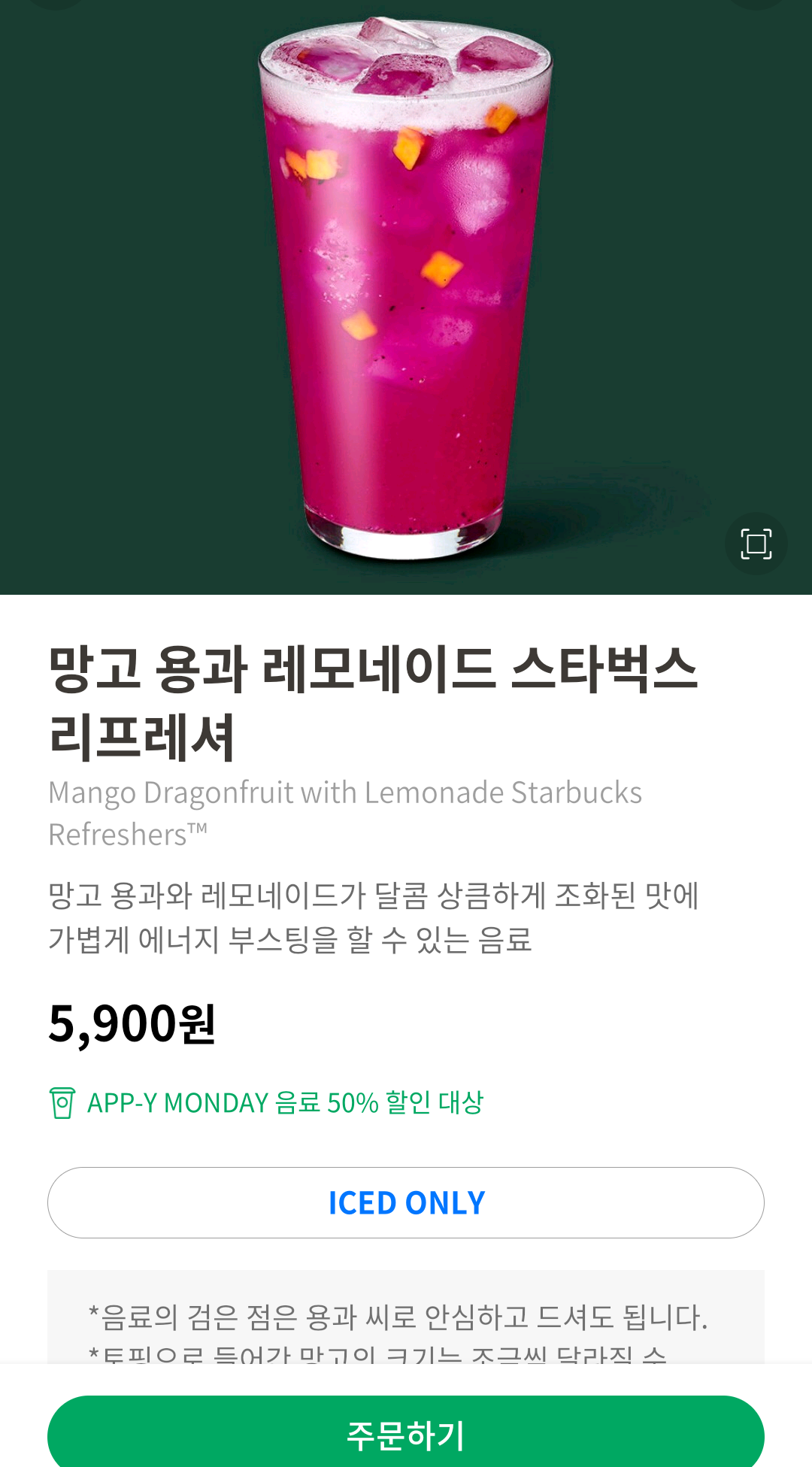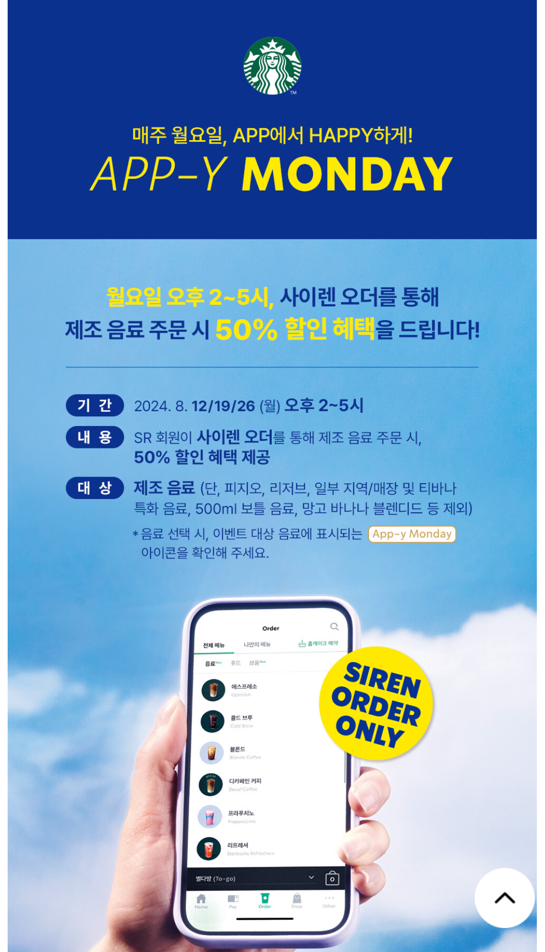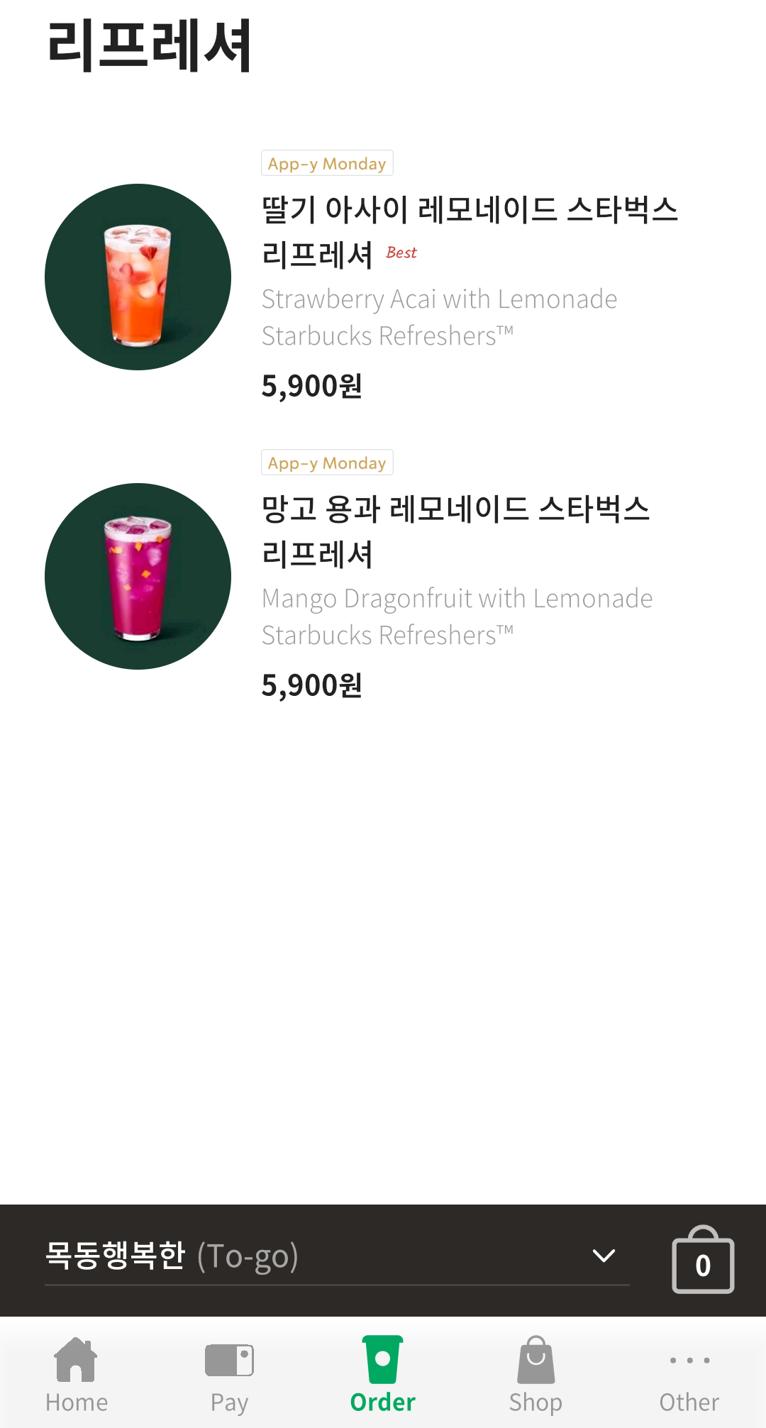 목동 행복한 백화점 스타벅스25주년 사이렌오더 월요일 오후 2~5시 50%할인 망고 용과 레모네이드 스타벅스 리프레셔 이효정 청룡🐉