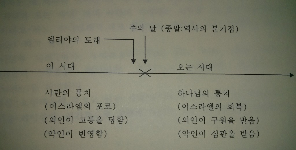 유대인의 종말론적 이해 구약은 죄와 사탄이 통치하는 시대를 끝내고 하나님께서 다스리시는 새 시대를 여시는 날을 ‘주의 날’ 또는 ‘마지막 날’로 서술한다. 하나님께서 보내신 메시아가 오시면 죄가 지배하는 이 시대를 끝내시고 새 시대를 여실 것이다. 그 메시아가 오는 날을 ‘주의 날’, ‘마지막 날’, 곧 ‘종말’로 부른다. 그런데 예수님 당시 대부분의 사람들이 가진 메시아 관은 죄를 용서받고 하나님의 백성으로 살게 되리라는 영적인 측면 보다는, 다윗과 같은 왕이 도래해서 바벨론-페르시아-헬라-로마로 이어지는 지긋 지긋한 이방민족의 통치를 끝내고, 다윗과 같은 왕국을 세워 열방을 지배하는 이스라엘이 될 것이라는 정치적, 군사적, 사회적, 경제적인 메시아 관을 가졌다. 이 요구를 만족해 줄 것 같지 않으니 유대인들은 예수님이 메시아 이심을 믿지 않고 그를 십자가에 매달아 죽여버렸다. 유대인의 종말관은 직선적이다(표1). 죄와 사탄이 통치하는 ‘이 시대’가 끝나면, 하나님이 통치하시는 ‘오는 시대’가 온다는 것이다.