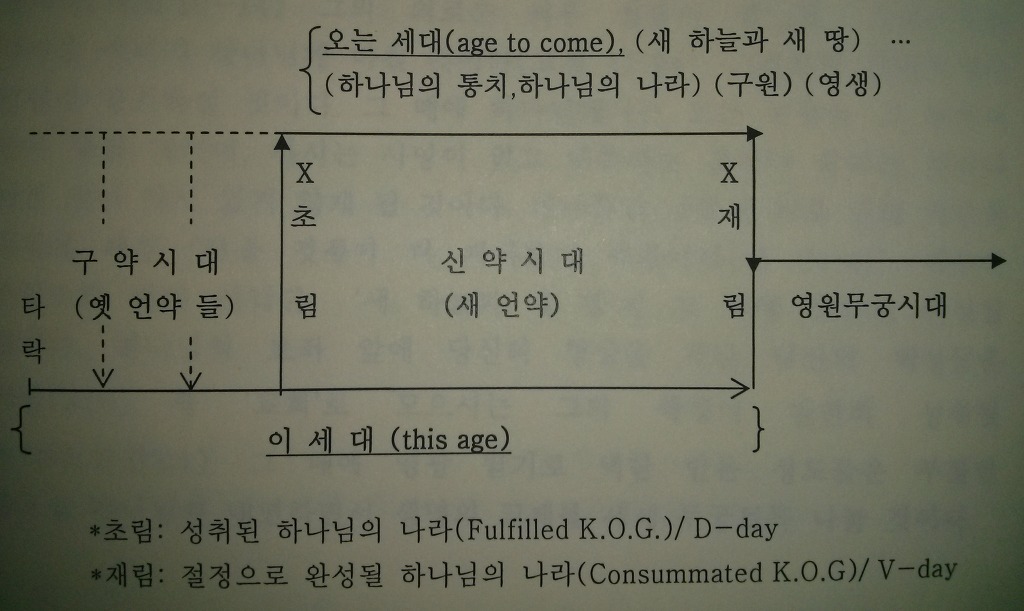 그런데 신약성경은 예수님의 오심으로 ‘오는 세대’, ‘하나님의 나라(천국)’가 도래했고 ‘영생’의 삶이 시작되었지만, 여전히 ‘옛 세대’, 곧 죄와 사탄이 지배하는 ‘이 세대’가 지속된다고 말씀한다. 마귀는 예수의 십자가와 부활의 구원사역으로 치명상을 입었고 결박되었다(마12:29). 그러나, 사탄과 귀신들은 아직도 불신세계를 지배하는 공중 권세 잡은 자이며(엡2:2), 마귀는 지금도 우는 사자와 같이 이미 구원 받은 성도들을 삼키려고 두루 찾아 다닌다(벧전 5:8). 말하자면, 신약성경은 ‘이 세대’와 ‘오는 세대’가 공존하고 있다고 말씀한다(표2 참조). 이러한 ‘이미 그러나 아직’ (already, but not yet)의 구도(표2 참조)는 하나님의 온전한 작정이 이루어지는 종말의 종말(the last day of the last days)인 그리스도의 재림 때까지 지속될 것이다.