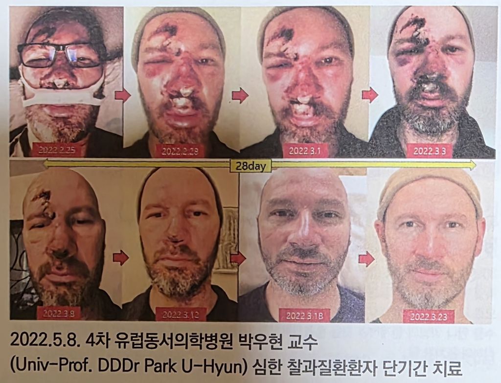 국립병원에서 교통사고 나서 눈 터지고, 코뼈 비중격골 부러짐. 응급조치후, 의료법인 동서의학 병원 내원. 일주일 Alpha-K 치료후, 급속도 로 좋아져 30일 후 완치하였음.