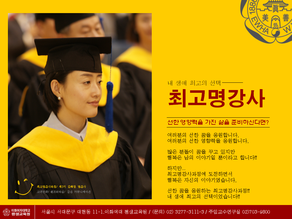 ------------------------------------------------------ 제11기 최고명강사과정 지원서 다운 받기!! ------------------------------------------------------ 국내 최고지도자과정 중에서 최초로 대한민국 HRD 대상을 수상한 최고명강사과정!! 많은 기관에서 추천과정으로 선정되어 점점 입학 경쟁률이 치열해지고 있습니다. 제11기 최고명강사과정에 지원하시고 싶은 분들은 지원서를 우선 접수해 주시기 부탁 드립니다. |