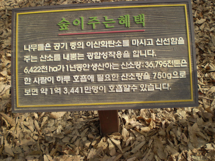 등산로 곳곳에 숲이 주는 혜택이 적힌 표시판이 아주 많이 있었다.