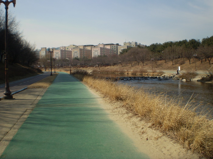 추위가 풀리고 봄기운이 감도는 날, 오랜만에 가볍게 높지 않은 산을 찾았다. 지;하철 분당선 오리역 3번 출구로 나가니 정면에 불곡산이 보였고, 그 뒷쪽으로는 수원의 광교산이 별로 멀지 않게 바라다 보였다. 불곡산을 향해 가는 길에 작은 강을 만나 따라가는데 좌우의 산책로가 잘 만들어져 있고 많은 사람들이 열심히 걷기 운동을 하는 모습을 볼 수 있었다.