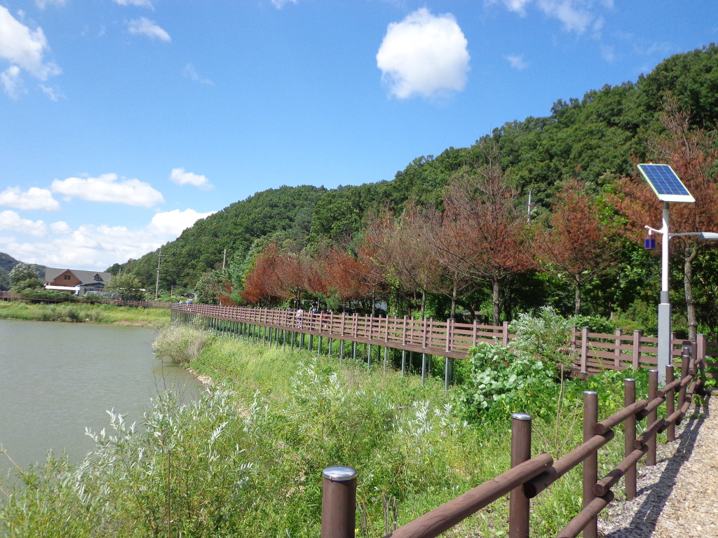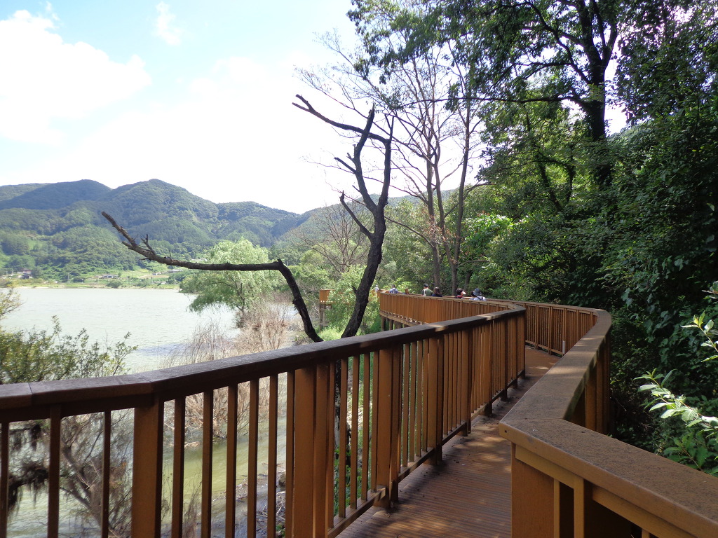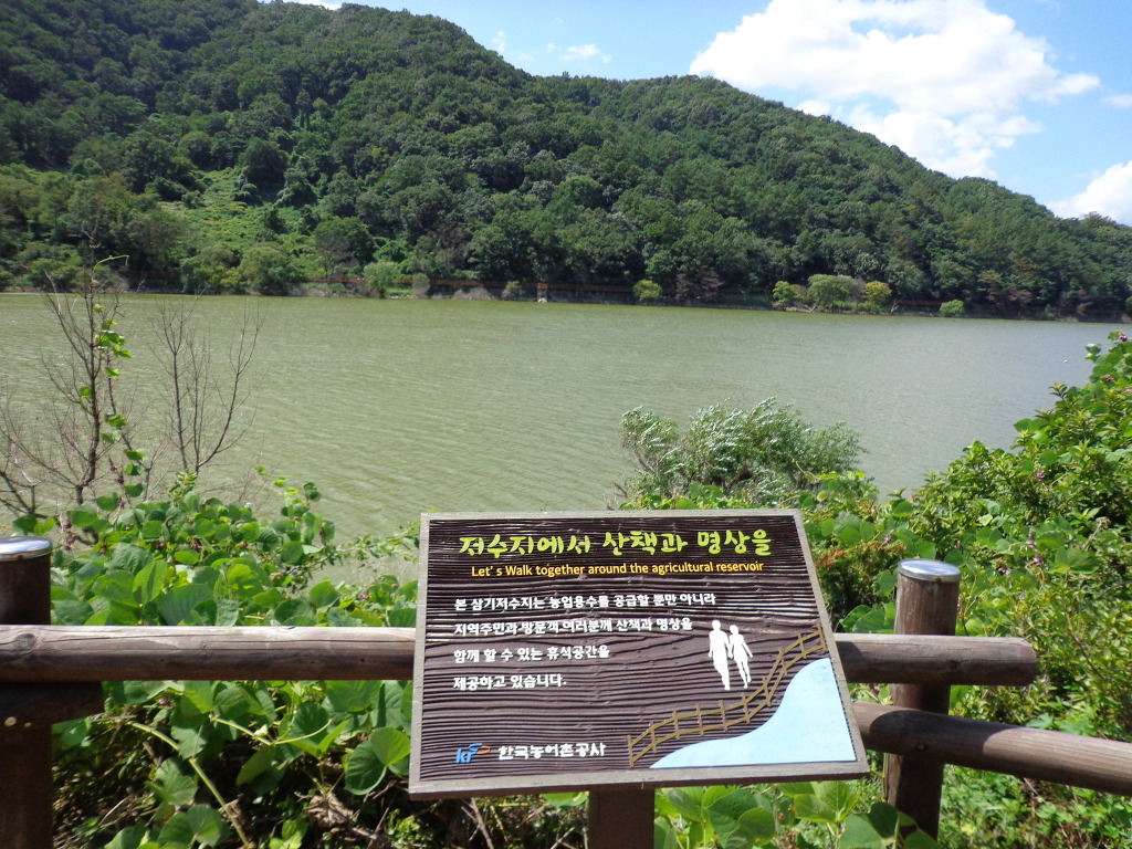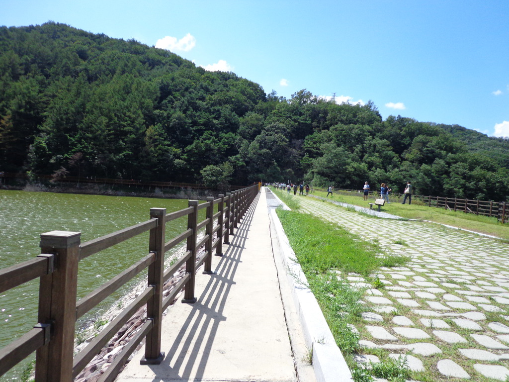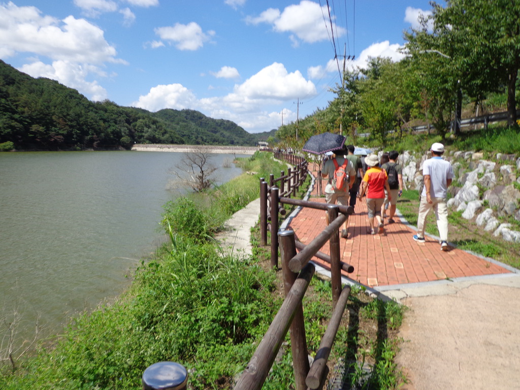 정안마을에서 점심까지 먹고, 오후 1시에 좌구산 아래 삼기저수지로 이동하여, 등잔길이라고 하는, 잘 만들어진 저수지 둘레길 2.2km를 약 50분 동안 트레킹 했다. 더운 날씨였지만 둘레길이 대부분 데크 길이었고, 바람도 불어 주었고, 경치가 좋아서인지 참가자들이 모두 걷는 것을 보았다. 저수지에서 좌구산 쪽으로 올라가면 증평의 아름다운 경치인 구름 다리도 있다고 하는데, 시간 제약으로 생략한다고 해서 서운했다. 교통이 좋지 않아 혼자서는 가기 어려운 곳인데 모처럼의 기회가 아쉬움을 주었다.