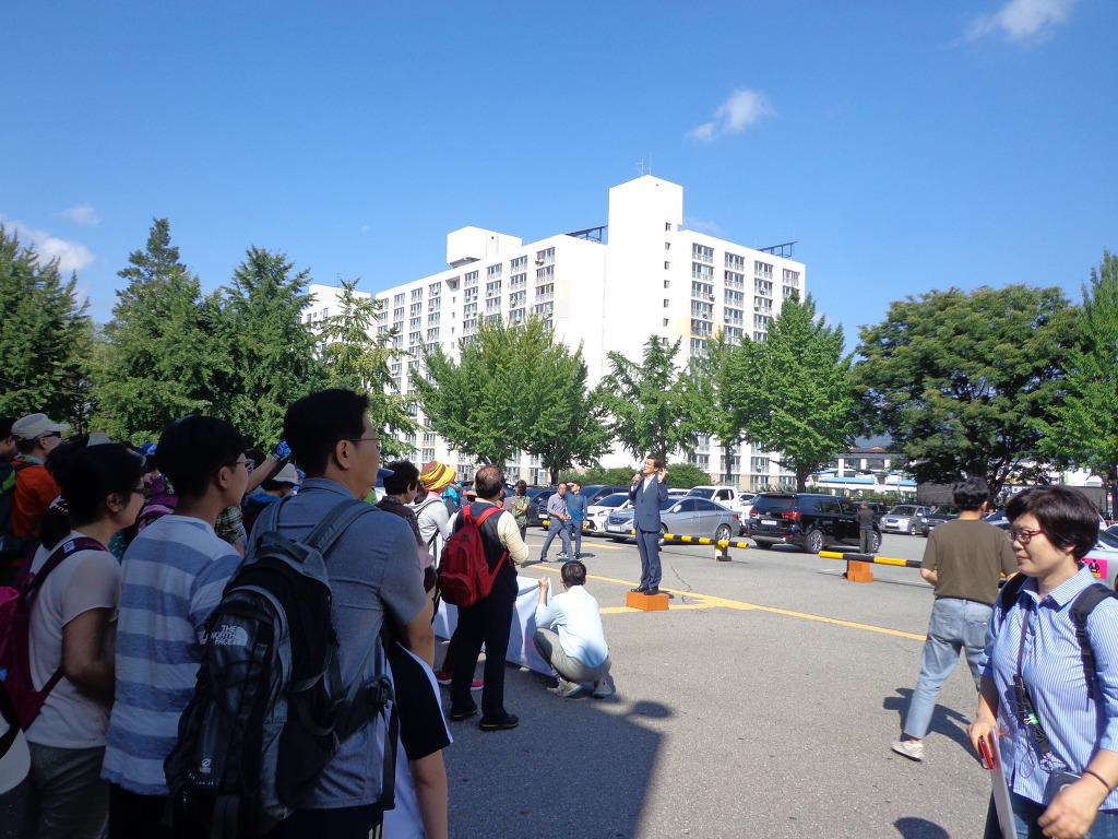 증평역 앞에서 증평 군수가 여행객들을 환영하는 인사를 하고 있다.
