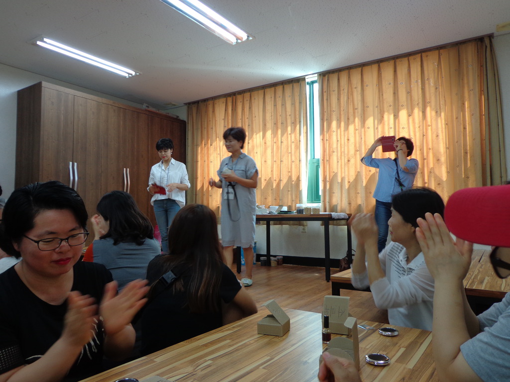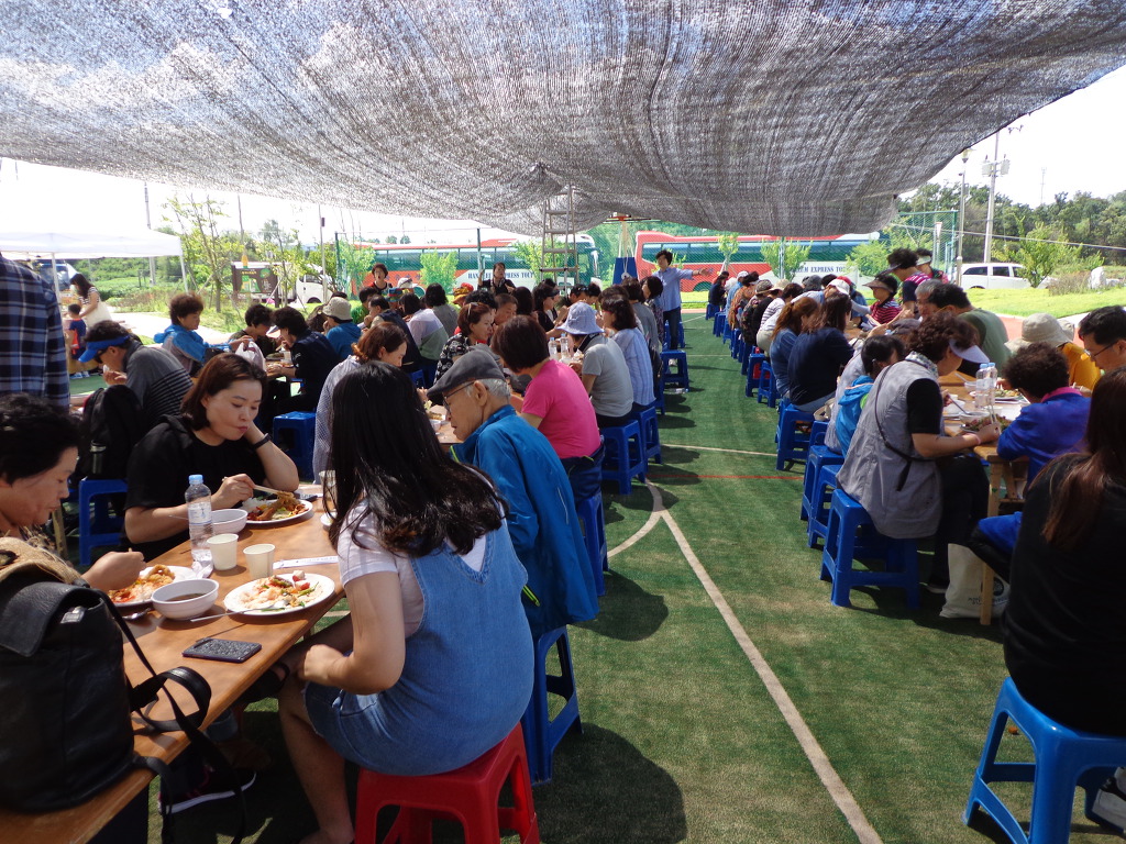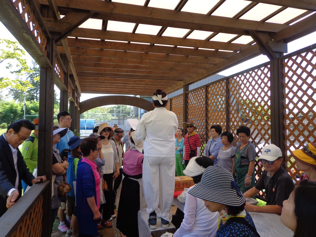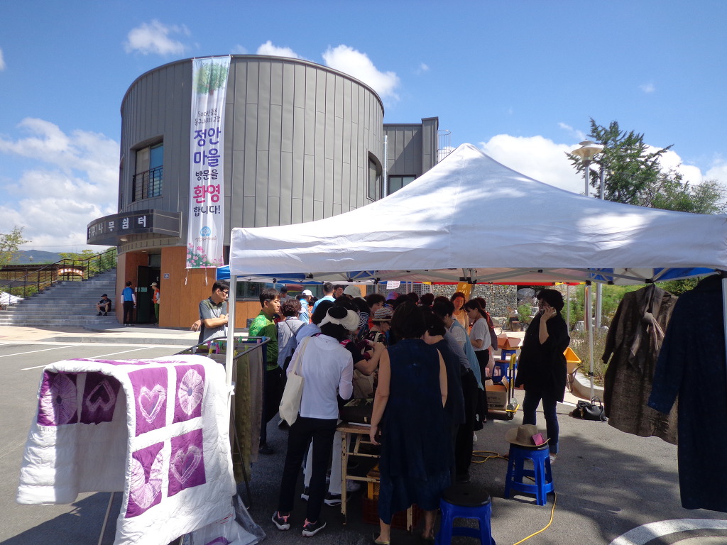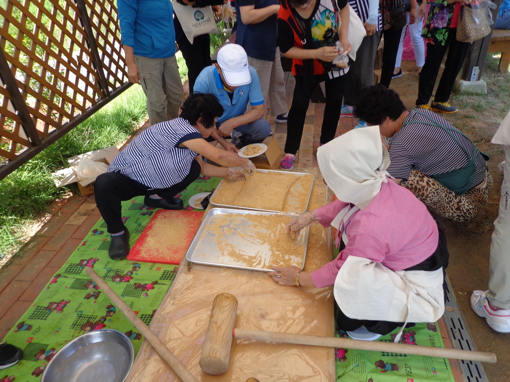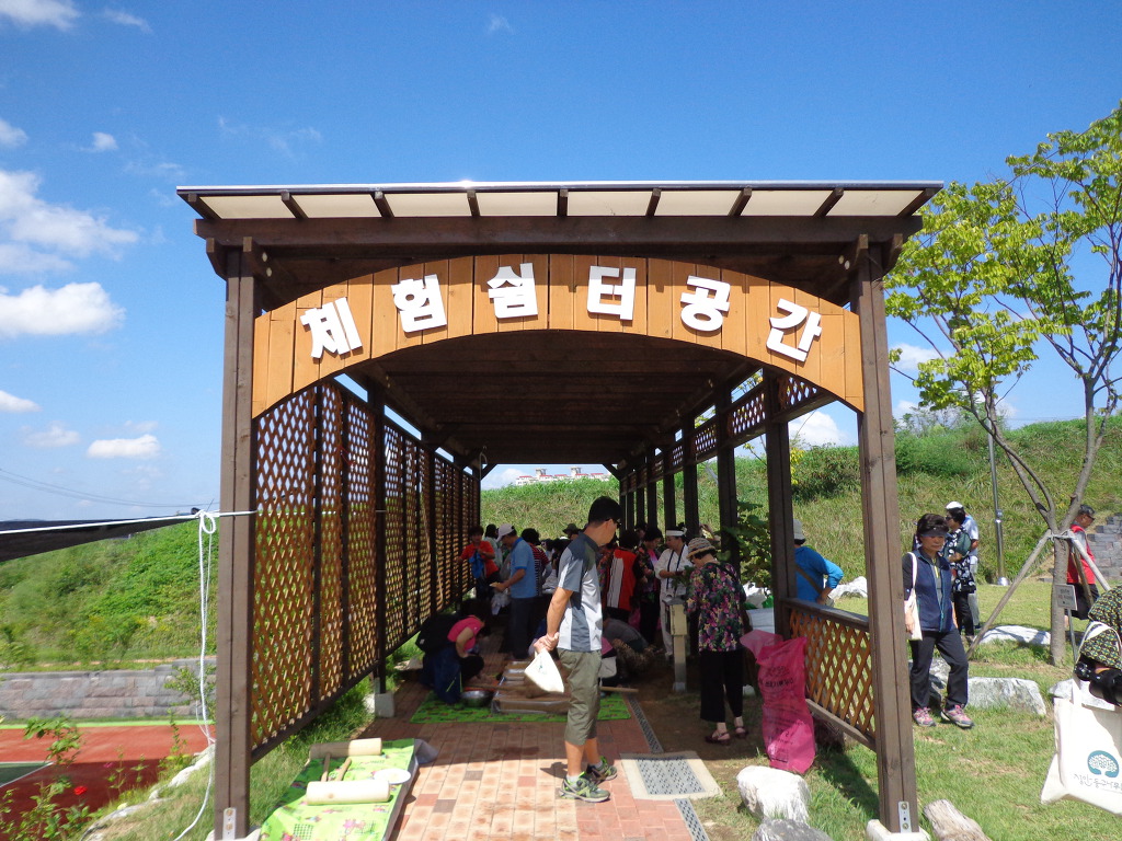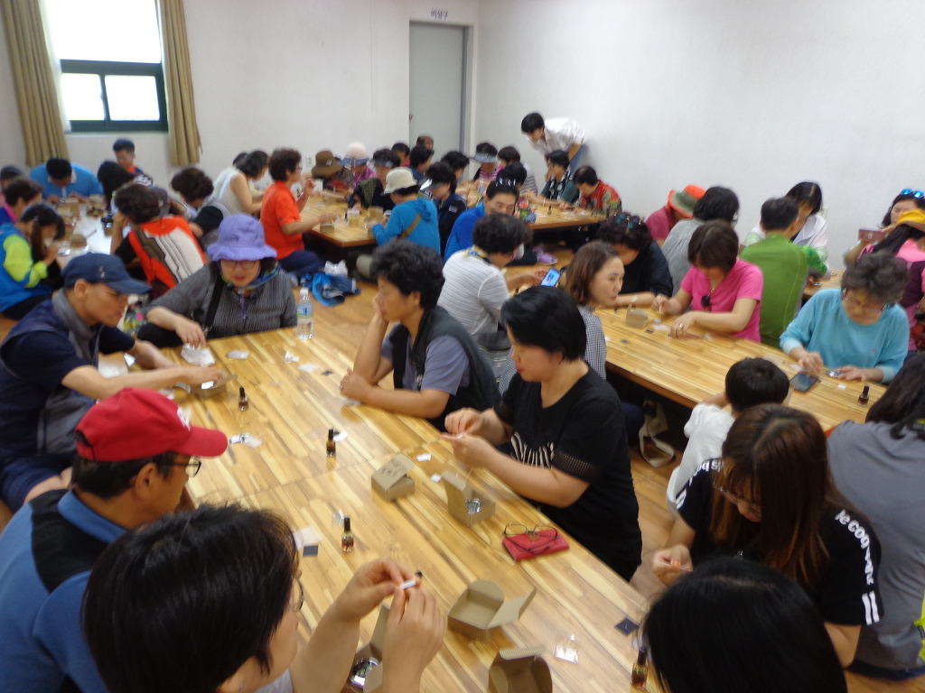 여행객들은 버스 6ㅐ에 나누어 타고, 3대씩 나누어 코스를 바꾸어 가면서, 증평지역을 여행했다. 내가 속한 팀은 먼저 정안마을에 가서 인절미 체험과 나전칠기 만들기체험을 했다. 인절미 체험은 인절미를 만들어 먹어보는 것이었다. 다른 곳에서는 인절미를 만들어 집에 가지고 왔었는데, 이번에는 그 자리에서 먹어 보는 것으로 끝이었다. 나전칠기 체험은 처음이고 재미 있었다. 여자들이 사용하는 접이식 거울 표면에 나비와 꽃 무늬의 나전칠기를 발라 작품을 만들어 가져왔다. 예술적 솜씨를 발휘해 보는 것 같은 기분이 들었고, 참가한 모든 사람들이 정성을 들여 작품을 만드는 것을 보았다. 두 가지 체험 후에 뷔페식으로 점심 대접도 받았다. 증평의 농산물을 판매하는 코너도 있었는데 많은 사람들이 구입하는 것도 보았다. 포도, 복숭아, 인삼, 꿀, 청국장, 참기름 등의 기름 종류, 각종 채소류 등 작은 장터에 상품이 깨끗하게 보였고 사람들의 시선을 끌었다.