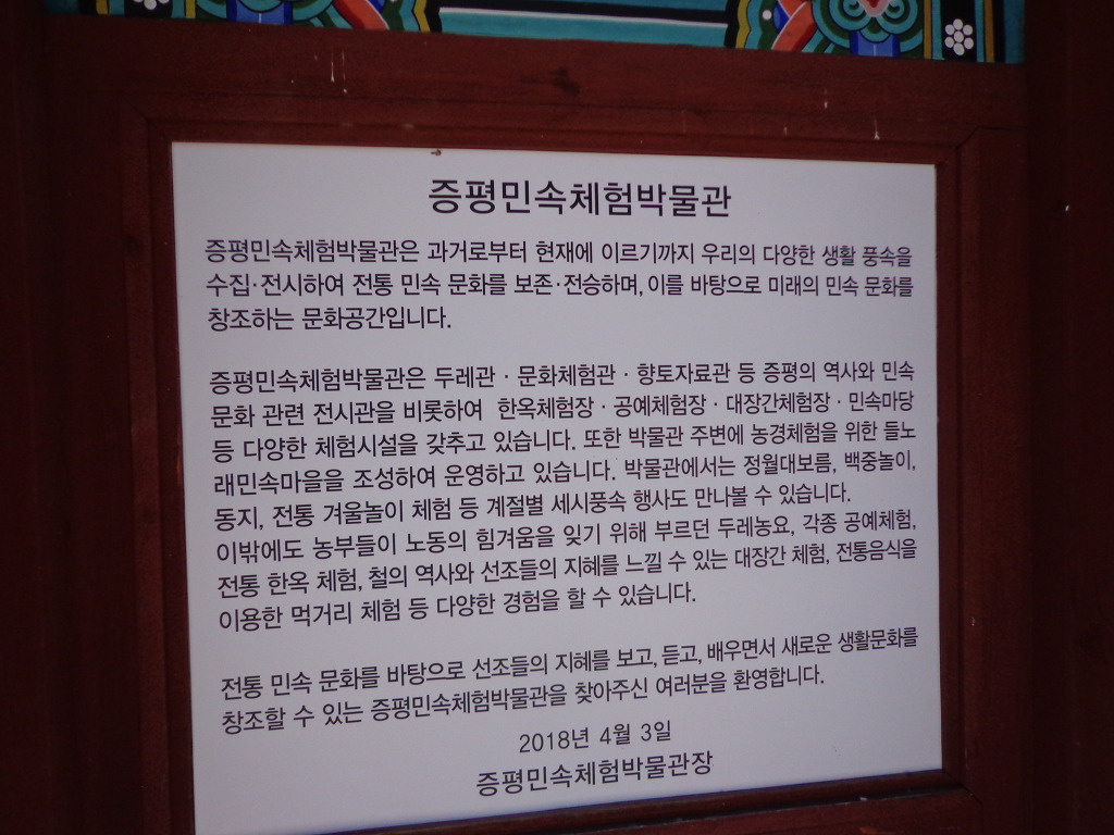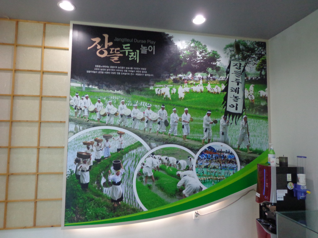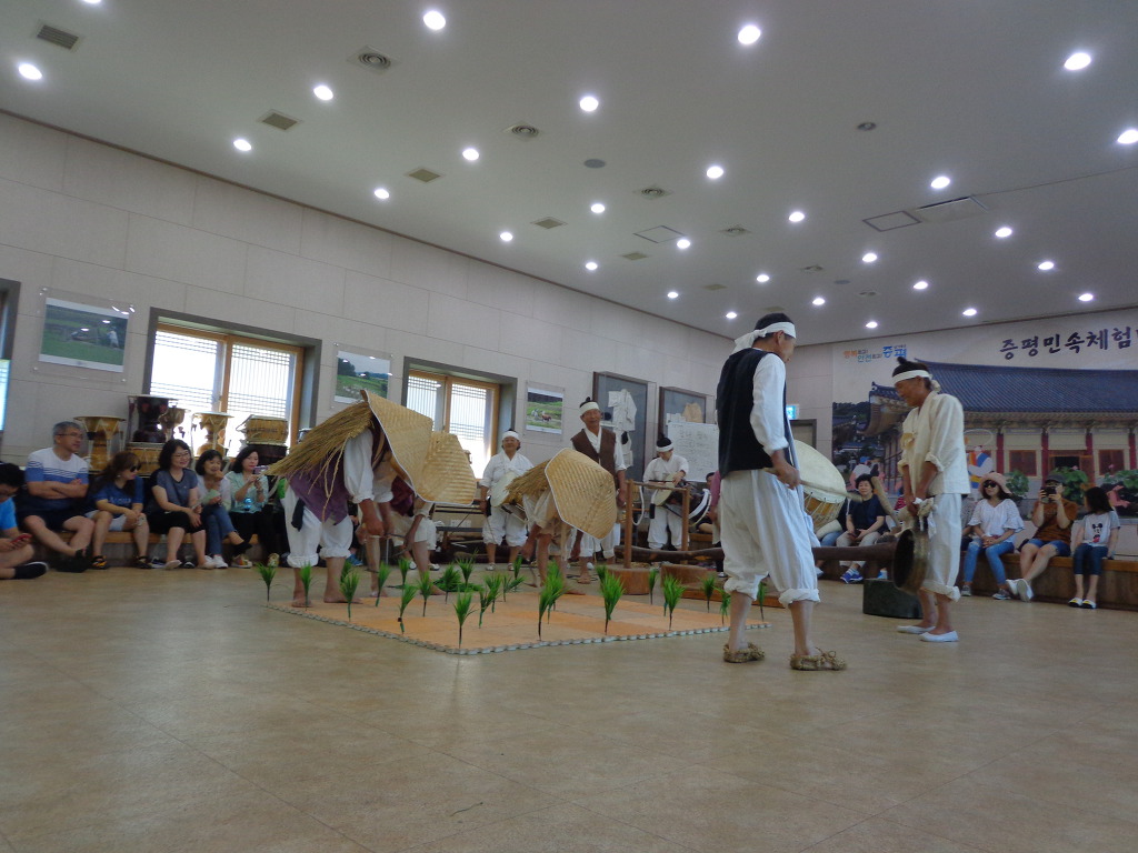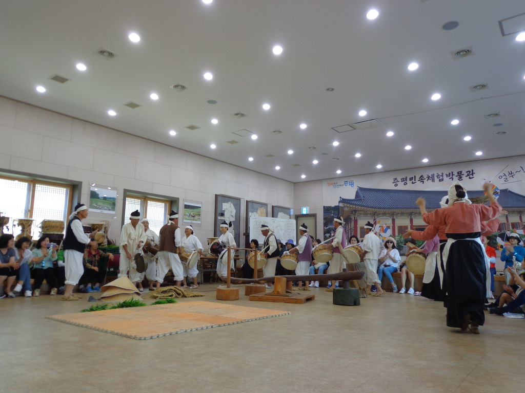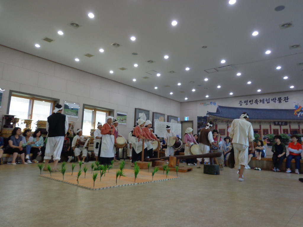 삼기저수지 트레킹을 마치고, 증평민속체험박물관으로 이동하여 박물관 경내를 구경하고, 장뜰두레 놀이라고 하는 공연 관람도 했다. 10여명의 나이 많은 분들이 모심기, 방아찍기 등을 농악으로 공연하는 것기었다. 잠시 흥을 돋우는 농악 놀이였다. 박물관은 터가 넓었고, 여러 가지 체험장들도 있어서 계획을 하고 가면 의미 있는 장소가 될 것 같았다. 지자체들의 노력으로 도시민들이 농촌에 관심을 가질 수 있게 하고, 함께 농촌의 발전도 이루어 보려고 하는 시도들이, 좋은 결실을 많이 맺였으면 좋겠다는 생각을 하게 하는 하루였다.