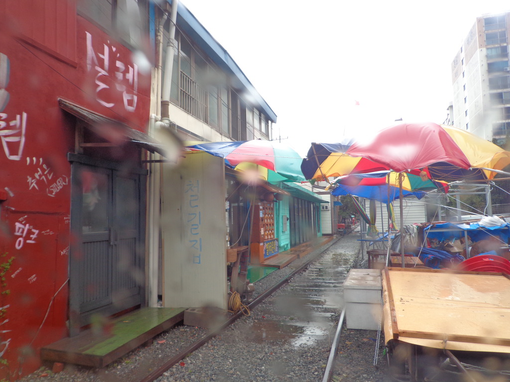 비가 와서 내리지는 못하고 차창 밖으로 보이는 옛 철도. 주변의 상가도 모두 철시 상태.