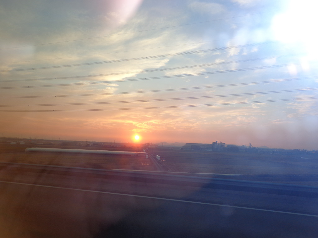 달리는 차안에서 보이는 차창밖의 들판과 석양의 해.